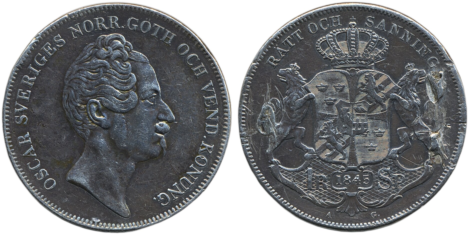 Coins, Sweden. Oskar I, SM 26, 1 riksdaler specie 1845. 33.76 g. Has been mounted. 1.