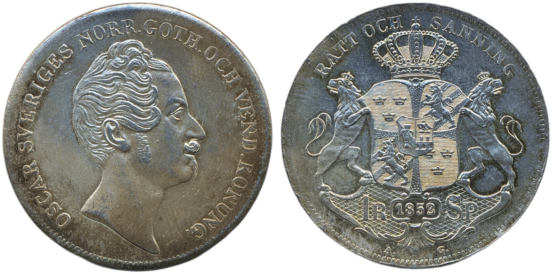 Coins, Sweden. Oskar I, SM 32, 1 riksdaler specie 1852. Lightly cleaned. 01.