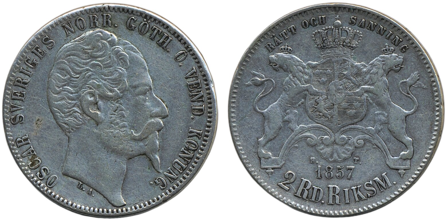 Coins, Sweden. Oskar I, SM 59, 2 riksdaler riksmynt 1857. Lightly cleaned. 1/1+.