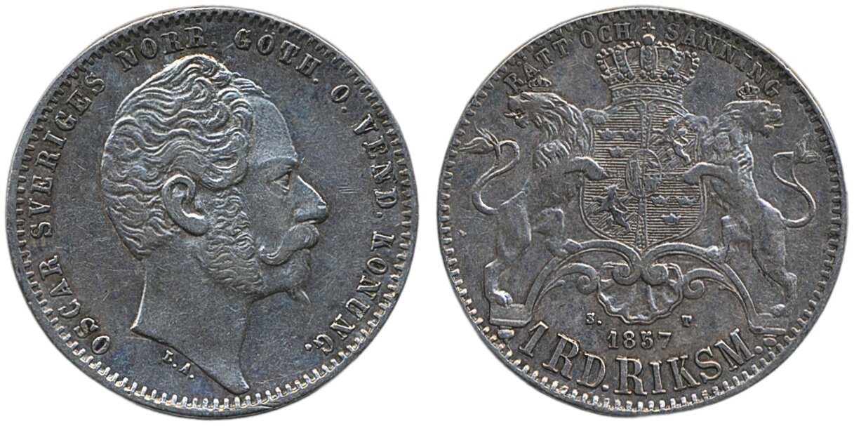 Coins, Sweden. Oskar I, SM 60a, 1 riksdaler riksmynt 1857. 1/1+.