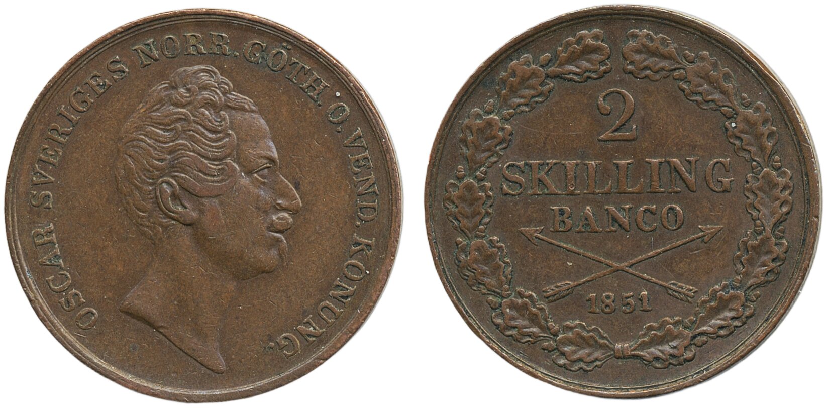 Coins, Sweden. Oskar I, SM 83, 2 skilling banco 1851. 18.76 g. R. 1+.