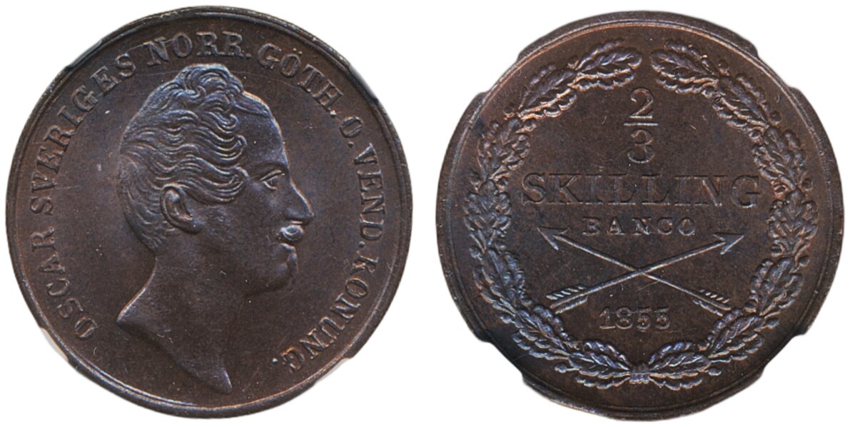 Coins, Sweden. Oskar I, SM 109, 2/3 skilling banco 1855. Graded by NGC as MS65 BN. 0. See certification at NGC