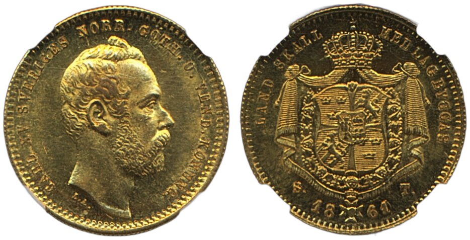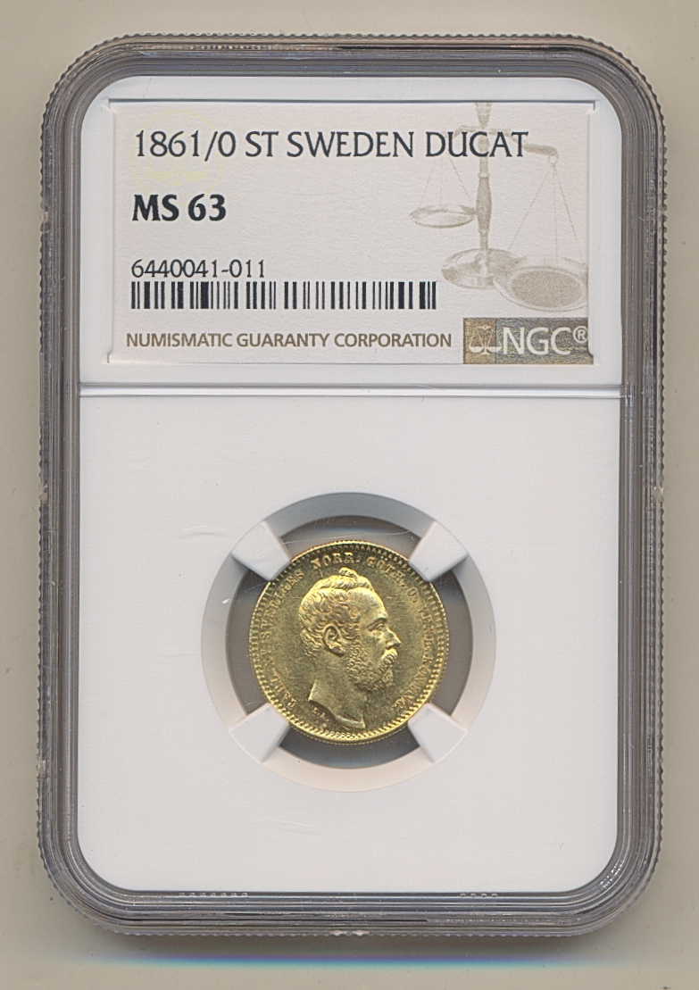 Coins, Sweden. Karl XV, SM 2, 1 dukat 1861/0. Seldom seen in this high quality – graded MS63 by NGC. 01/0. See certification at NGC
