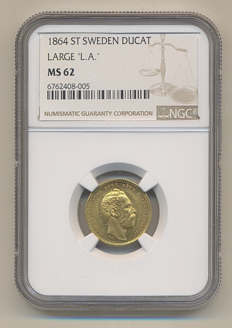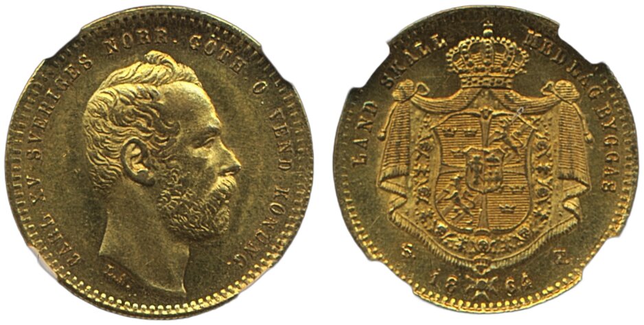 Coins, Sweden. Karl XV, SM 5, 1 dukat 1864. Seldom seen in this high quality – graded MS62 (only two higher) by NGC. 01/0. See certification at NGC