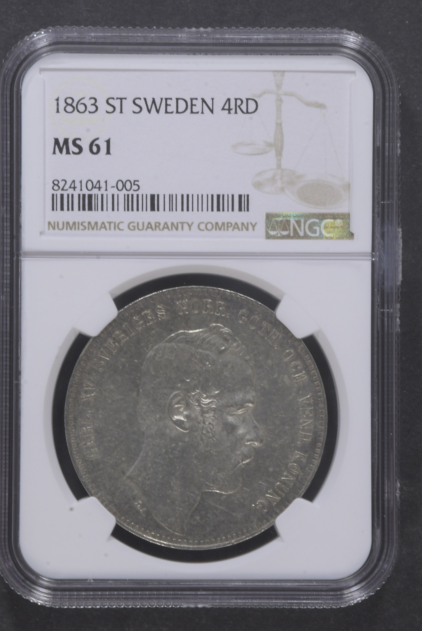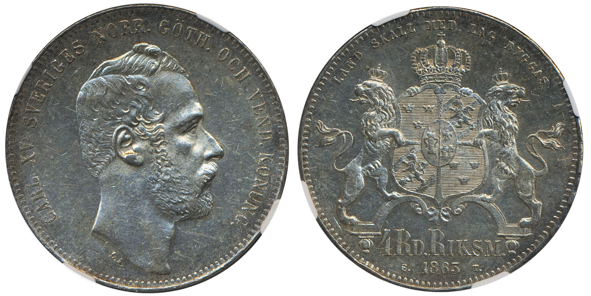 Coins, Sweden. Karl XV, SM 16, 4 riksdaler riksmynt 1863. Graded by NGC as MS61. 01. See certification at NGC