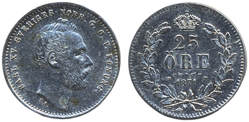 Coins, Sweden. Karl XV, SM 41, 25 öre 1871. 2.08 g, ex Hamrin. 01.
