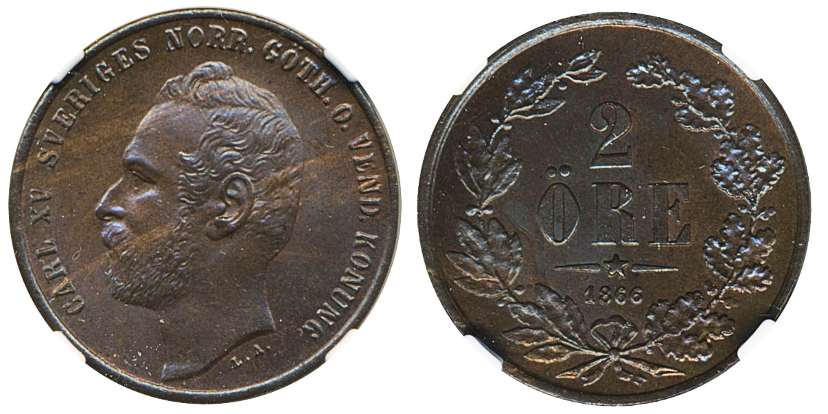 Coins, Sweden. Karl XV, SM 66, 2 öre 1866. Graded by NGC as MS65 BN. 0. See certification at NGC