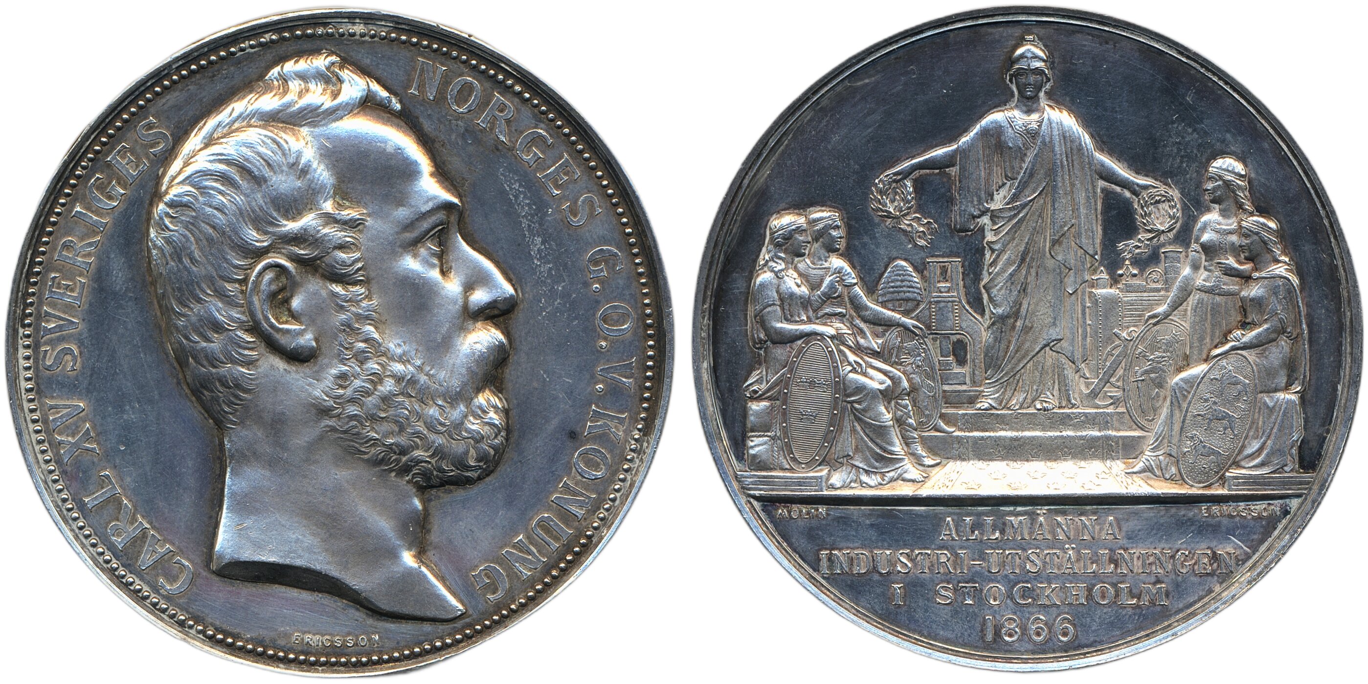 Medals, regal, Sweden. Karl XV, Hild. p.461, 12, 91.06 g, 58 mm. Silver medal to Industrial exhibition in Stockholm 1866. Lightly cleaned, hairlines. Edge inscription Casparsson & Schmidt. 01.