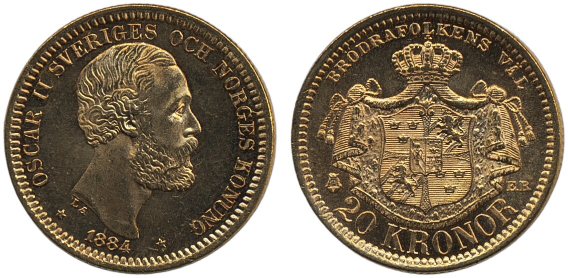 Coins, Sweden. Oskar II, SM 12, 20 kronor 1884. 01/0.