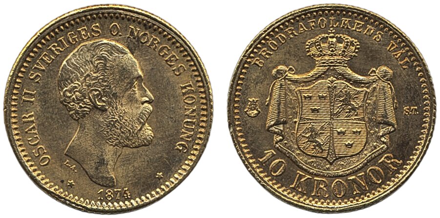 Coins, Sweden. Oskar II, SM 25a, 10 kronor 1874. 01/0.