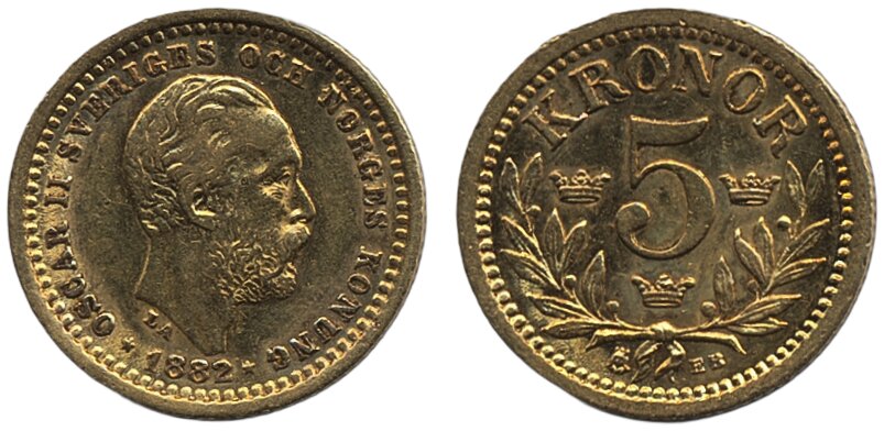 Coins, Sweden. Oskar II, SM 35, 5 kronor 1882. 1+/01.