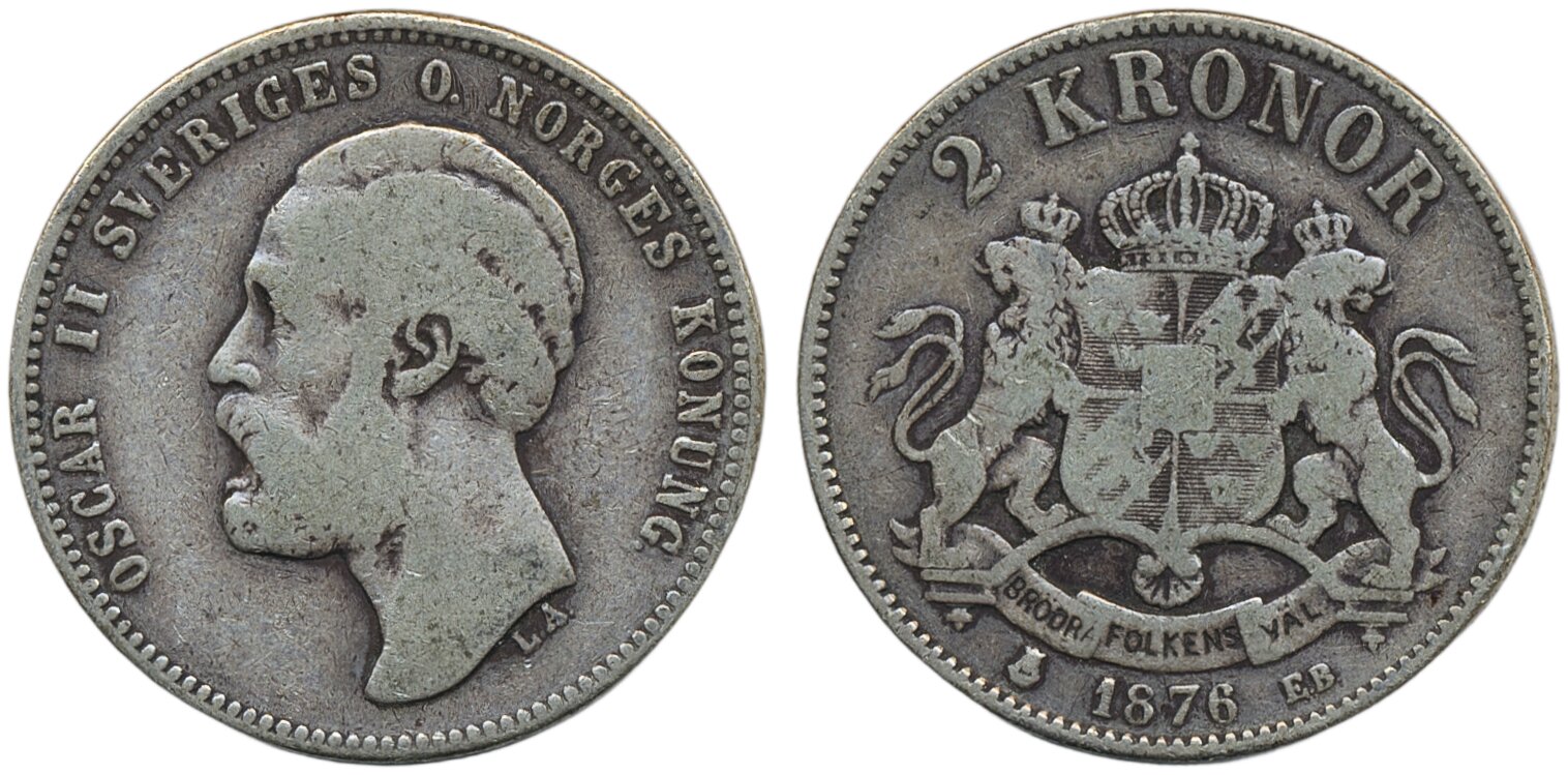 Coins, Sweden. Oskar II, MIS I.1b, 2 kronor 1876. Wide date, small EB. 1?