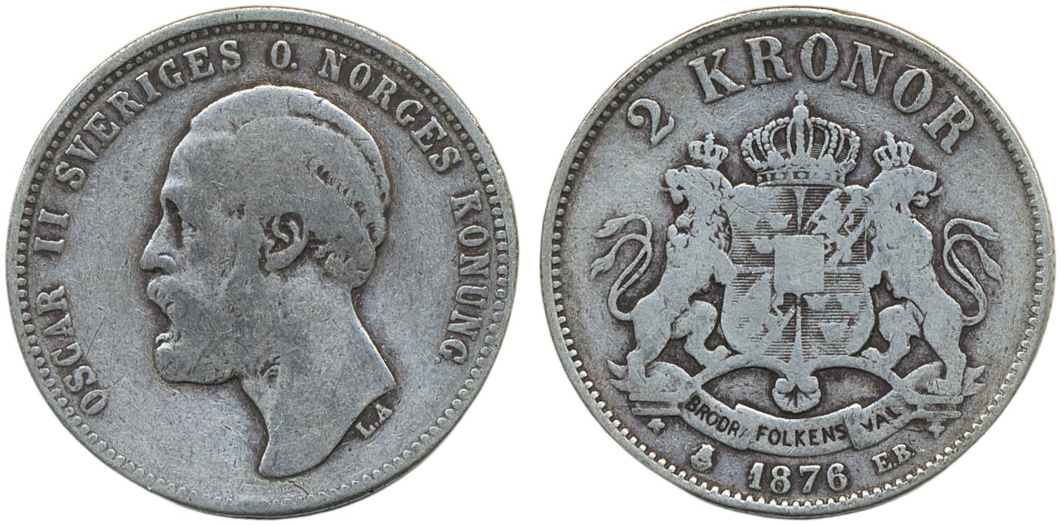 Coins, Sweden. Oskar II, MIS I.1b, 2 kronor 1876. Wide date, small EB. 1?