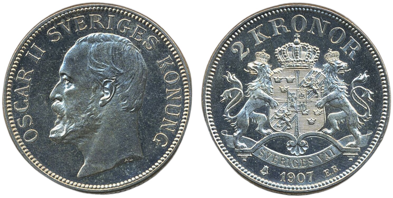 Coins, Sweden. Oskar II, MIS V.2, 2 kronor 1907. 01/0.