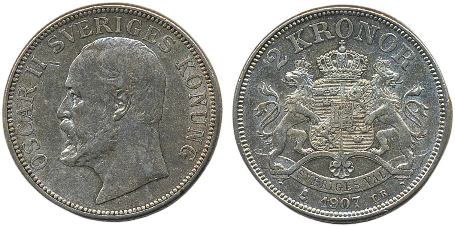 Coins, Sweden. Oskar II, MIS V.2, 2 kronor 1907. 1+/01)(01.