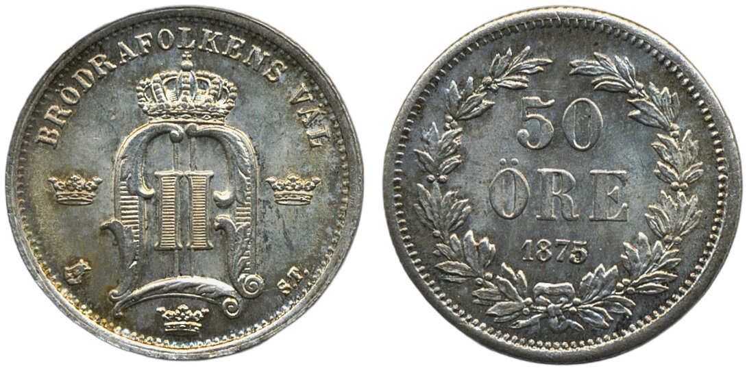 Coins, Sweden. Oskar II, MIS I.2a, 50 öre 1875. Beautiful and lustrous example with light toning. 01/0.