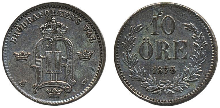 Coins, Sweden. Oskar II, MIS I.2b, 10 öre 1875. Key date. Minor scratch. 1+/01.