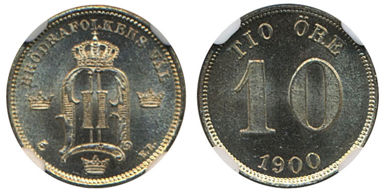 Coins, Sweden. Oskar II, MIS II.17b, 10 öre 1900. Graded by NGC as MS64. 01/0. See certification at NGC