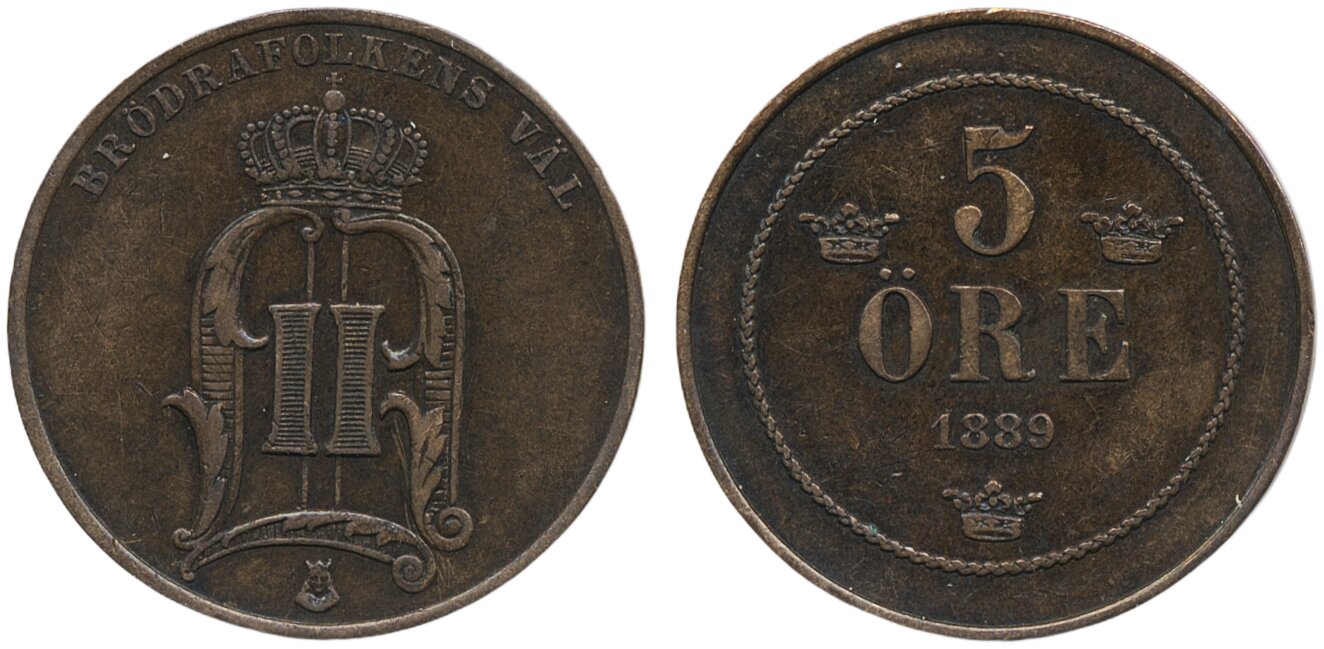 Coins, Sweden. Oskar II, MIS I.20, 5 öre 1889. 1+.