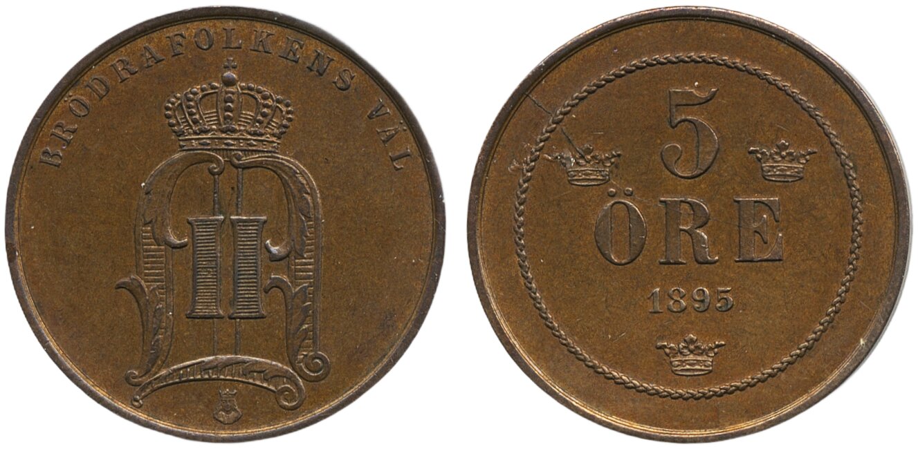 Coins, Sweden. Oskar II, MIS I.26, 5 öre 1895. Lustrous example with small contact marks. 01/0.