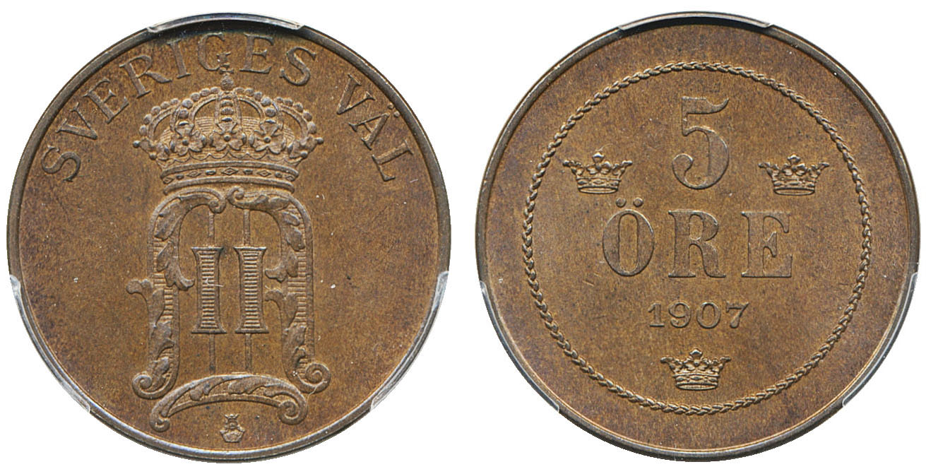 Coins, Sweden. Oskar II, MIS II.2, 5 öre 1907. Graded by PCGS as MS65 BN. 0. See certification at PCGS