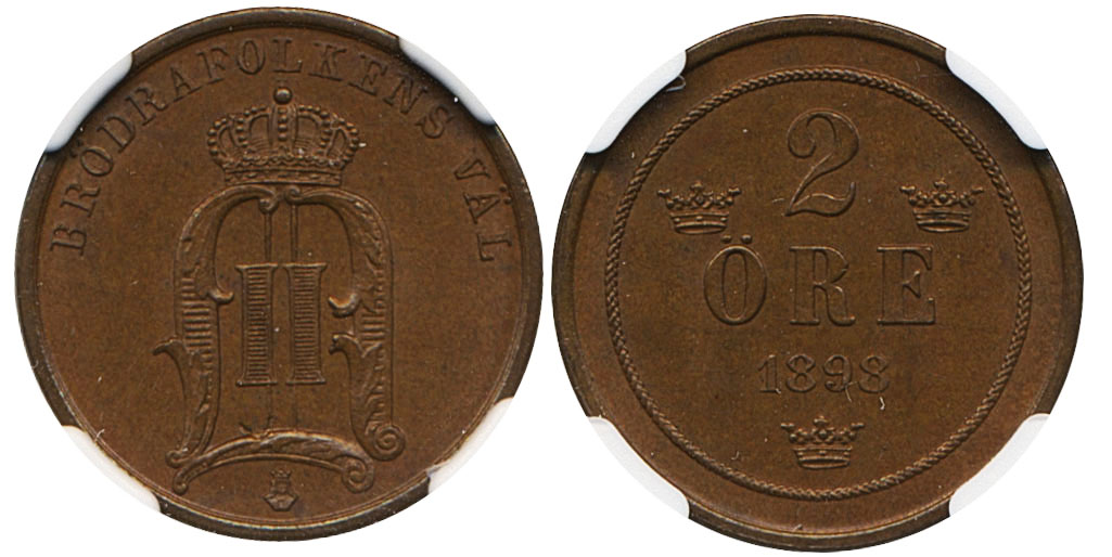 Coins, Sweden. Oskar II, MIS II.27a, 2 öre 1898. Small cross variety. Graded by NGC as MS65 BN. 0. See certification at NGC
