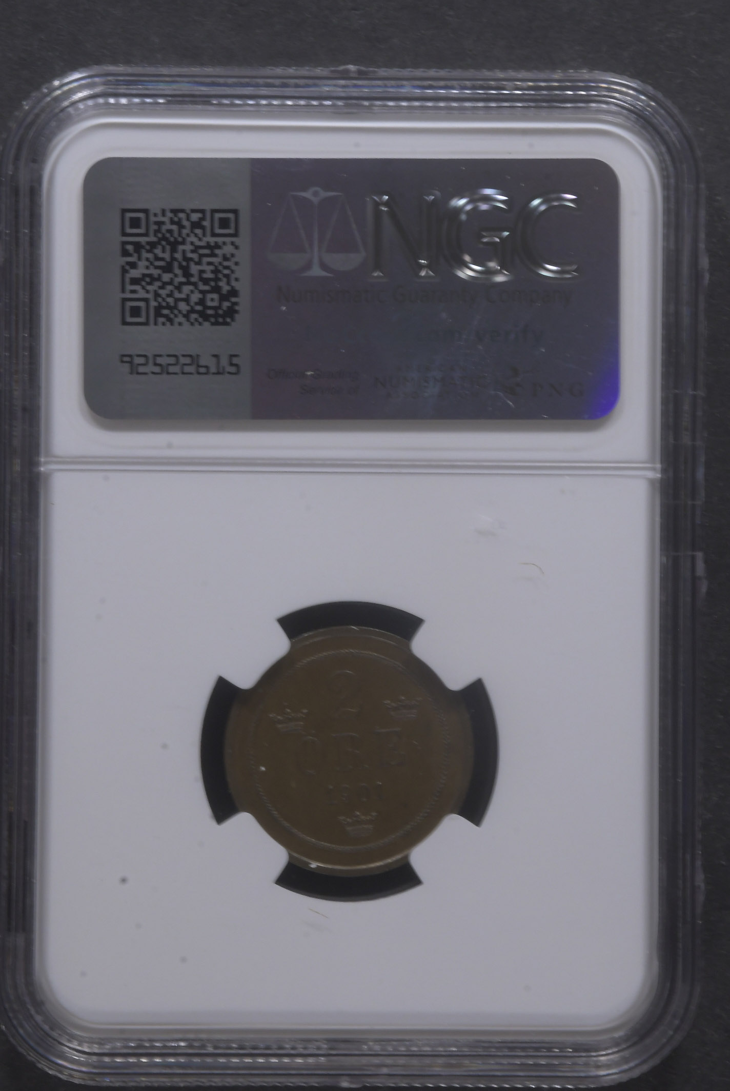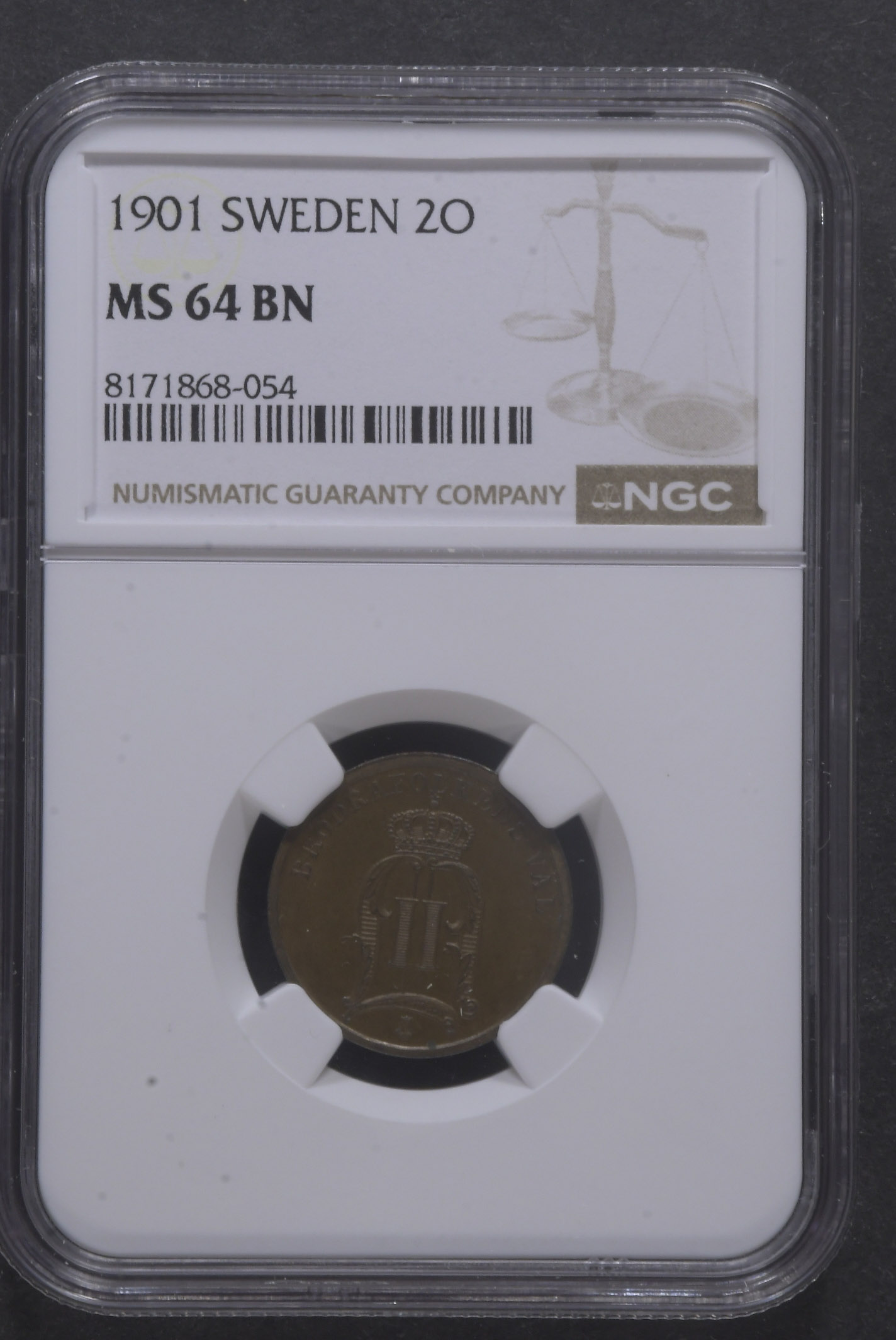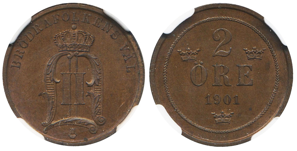Coins, Sweden. Oskar II, MIS II.31, 2 öre 1901. Low blade in centre of Svea crowns – more scarce variety. Graded by NGC as MS64 BN. 01/0. See certification at NGC