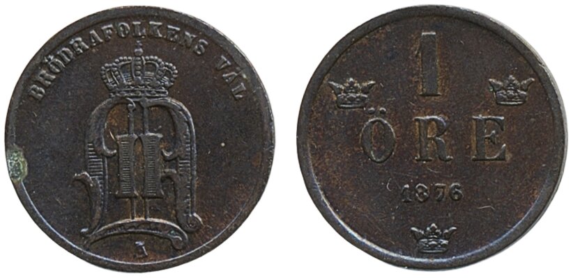 Coins, Sweden. Oskar II, MIS I.3, 1 öre 1876. Obverse minor verdigris spot, else lustrous. 01.