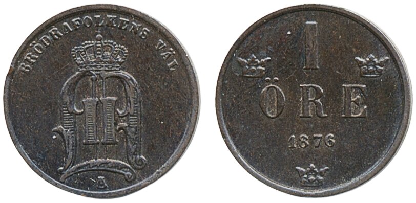 Coins, Sweden. Oskar II, MIS I.3, 1 öre 1876. Miniscule rim nick. Else a nice example of a better date. 1+/01.