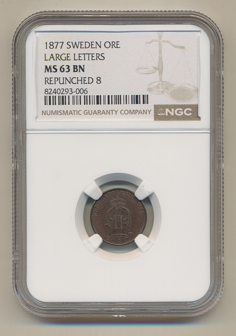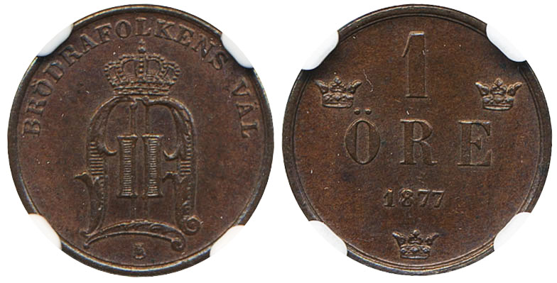 Coins, Sweden. Oskar II, MIS II.1b, 1 öre 1877. Re-punched 8. Scarce variety. Graded by NGC as MS63 BN. 01/0. See certification at NGC