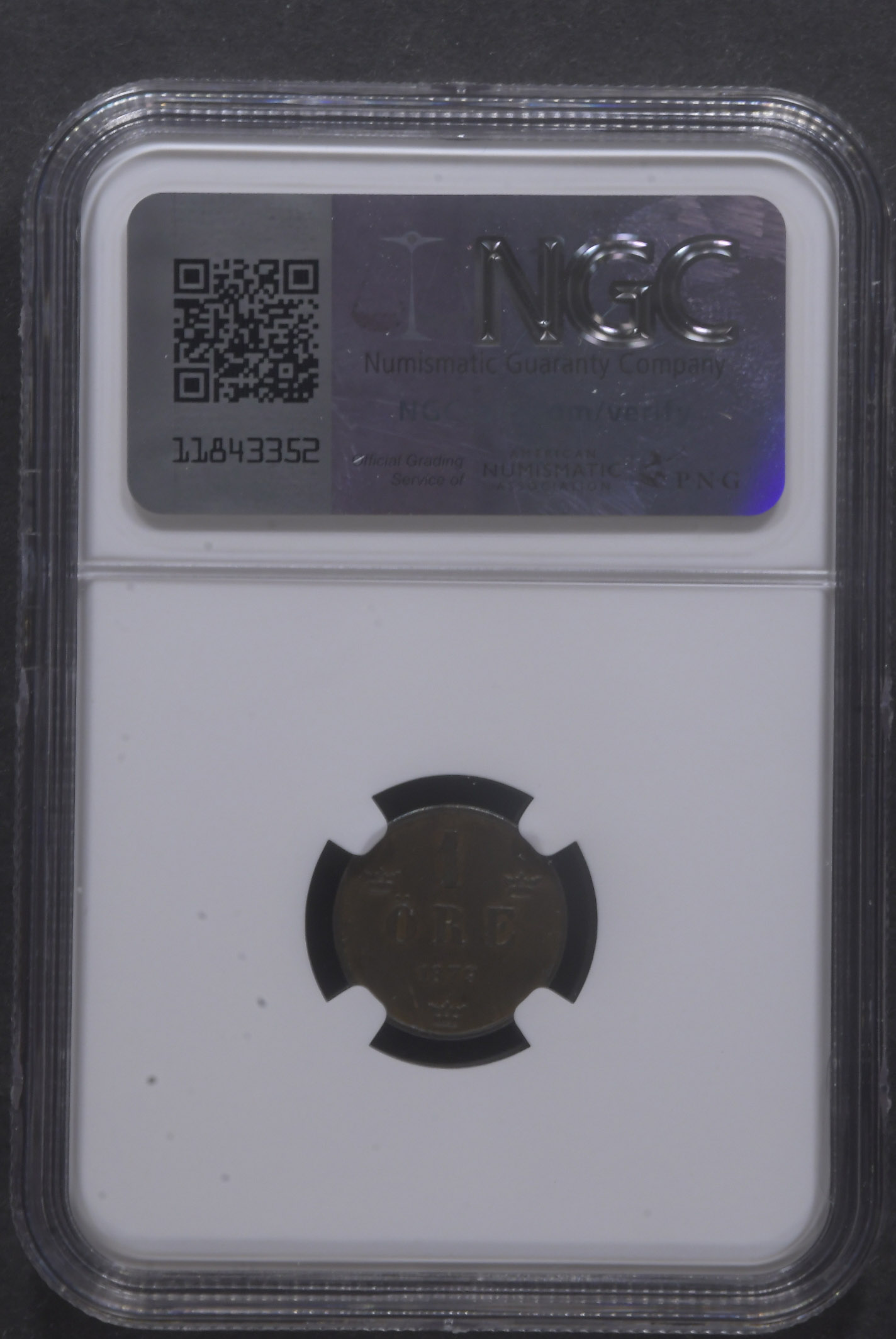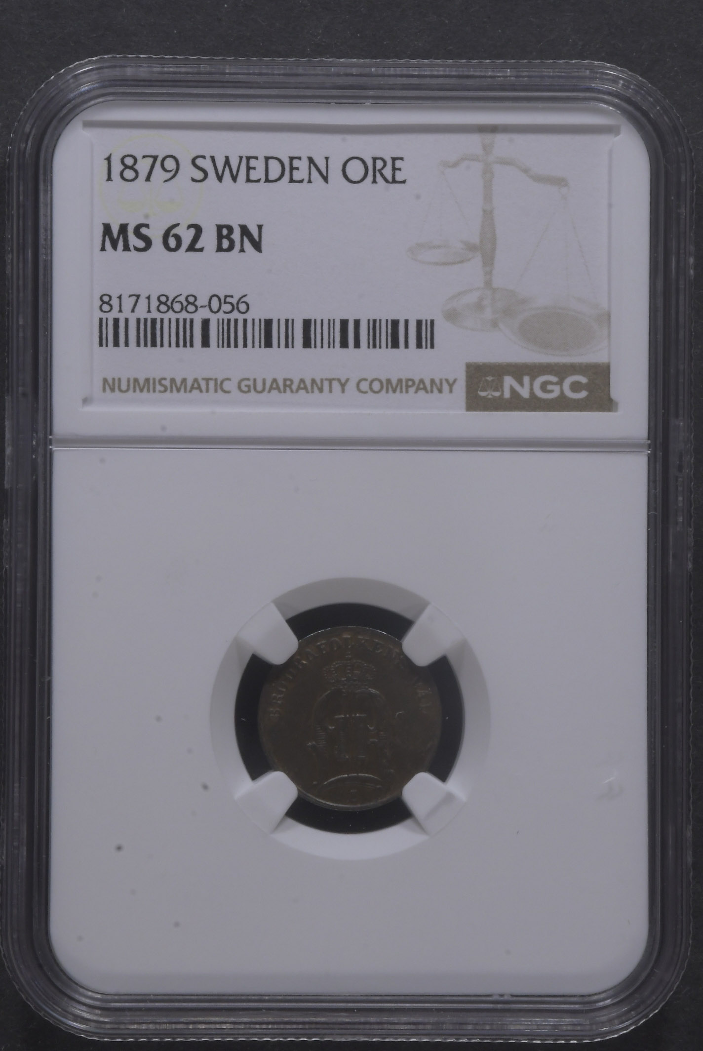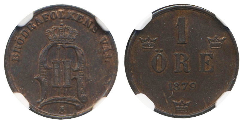 Coins, Sweden. Oskar II, MIS II.3c, 1 öre 1879. Graded by NGC as MS62 BN. Second finest graded by NGC! 01/0. See certification at NGC