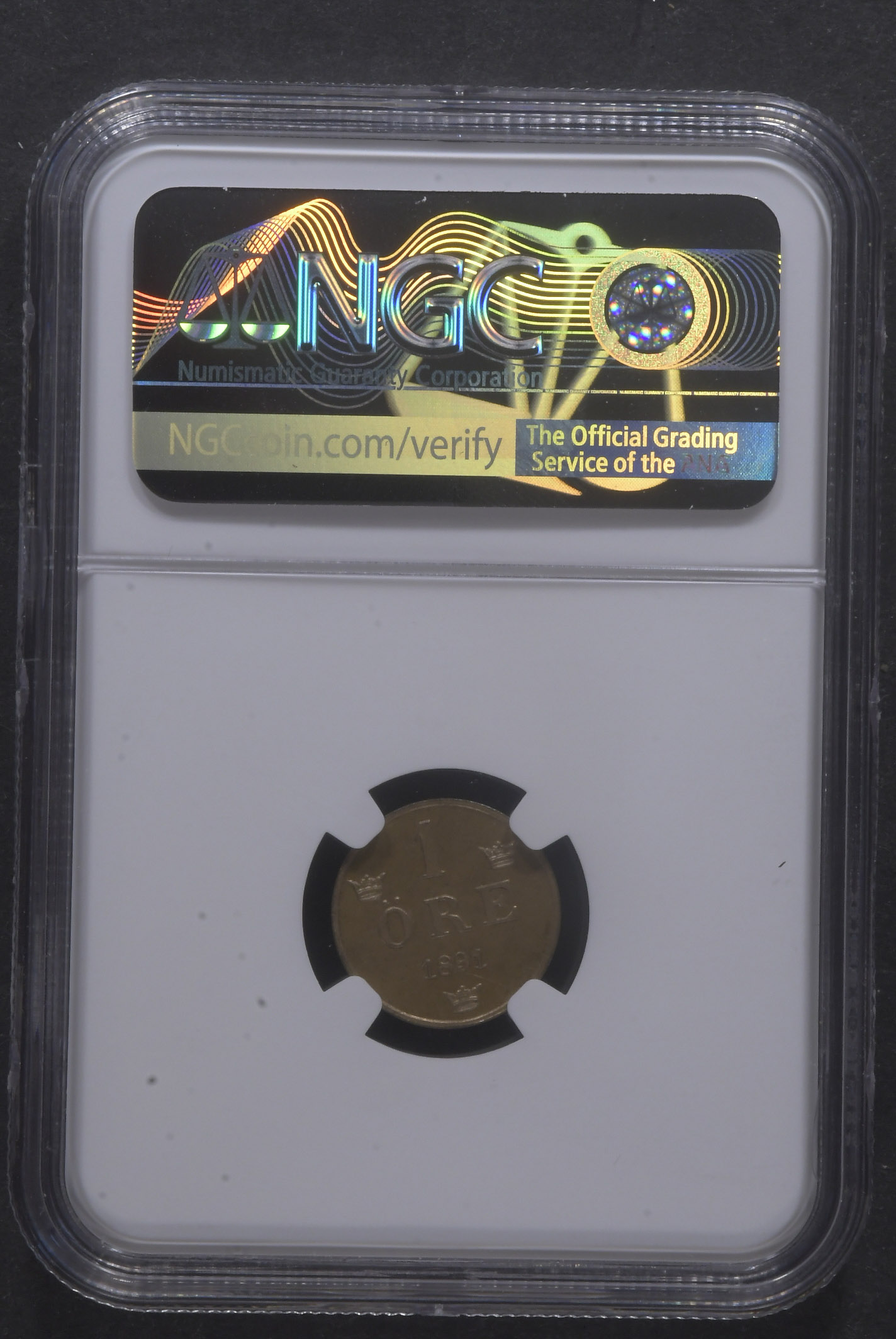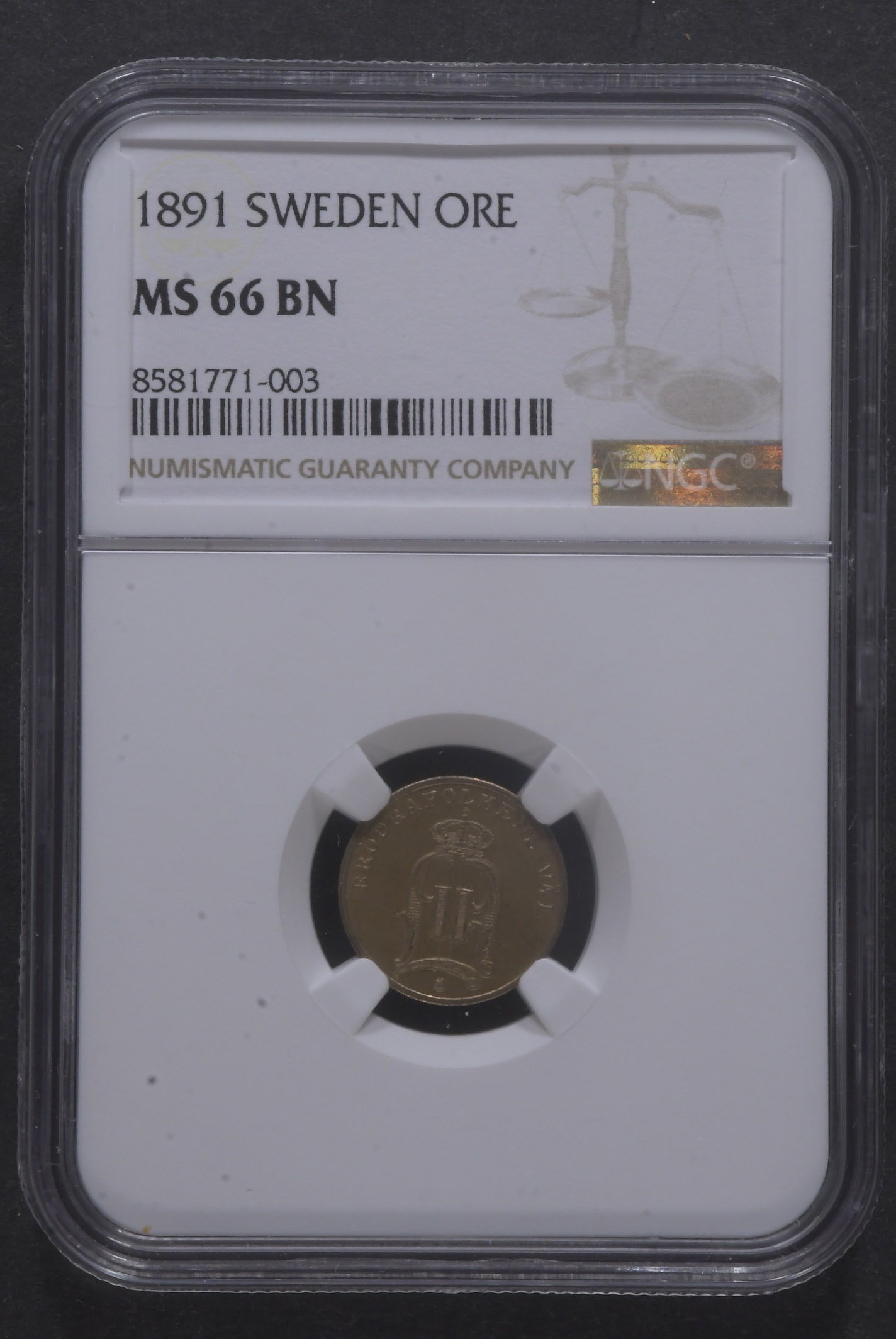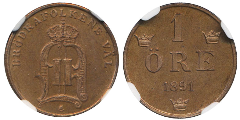Coins, Sweden. Oskar II, MIS III.16, 1 öre 1891. Graded by NGC as MS66 BN. Finest graded by NGC. 0. See certification at NGC