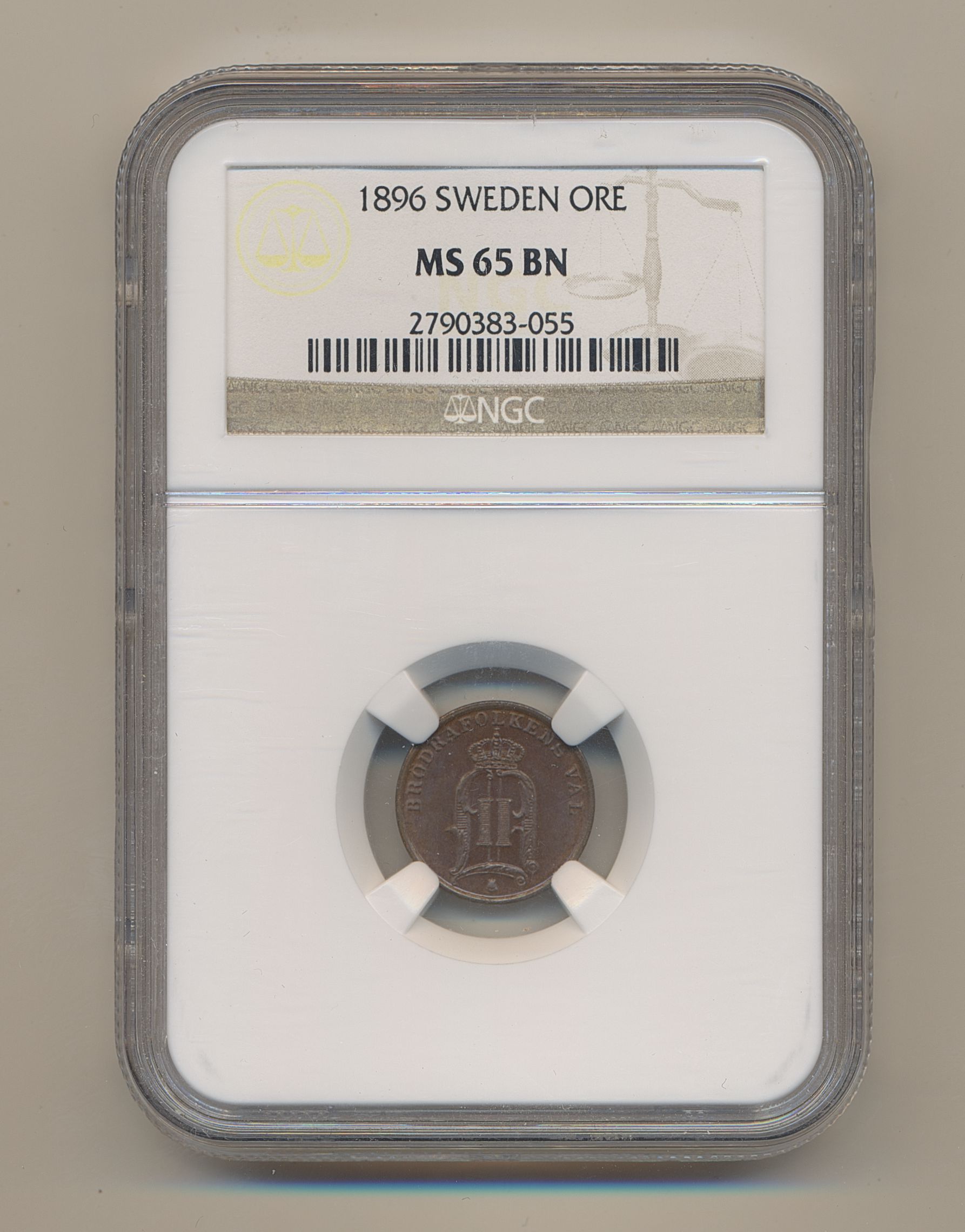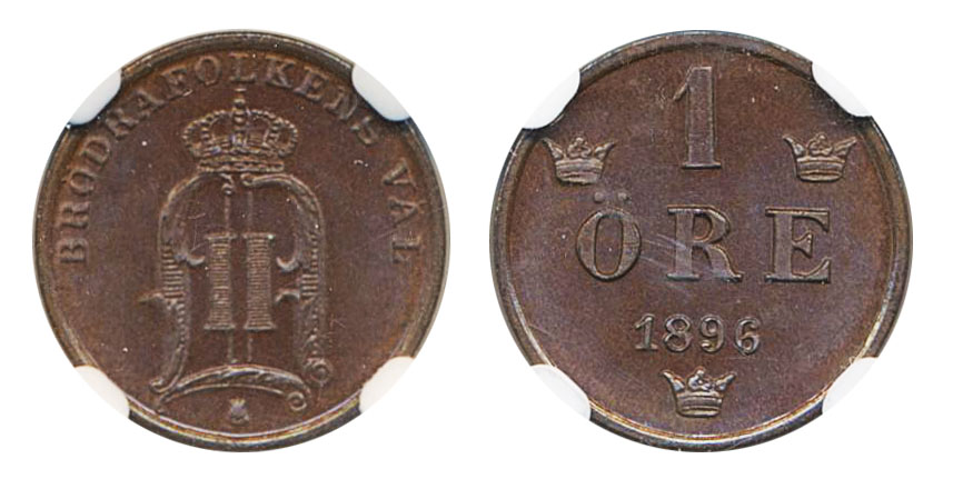 Coins, Sweden. Oskar II, MIS III.21, 1 öre 1896. Graded by NGC as MS65 BN. 0. See certification at NGC
