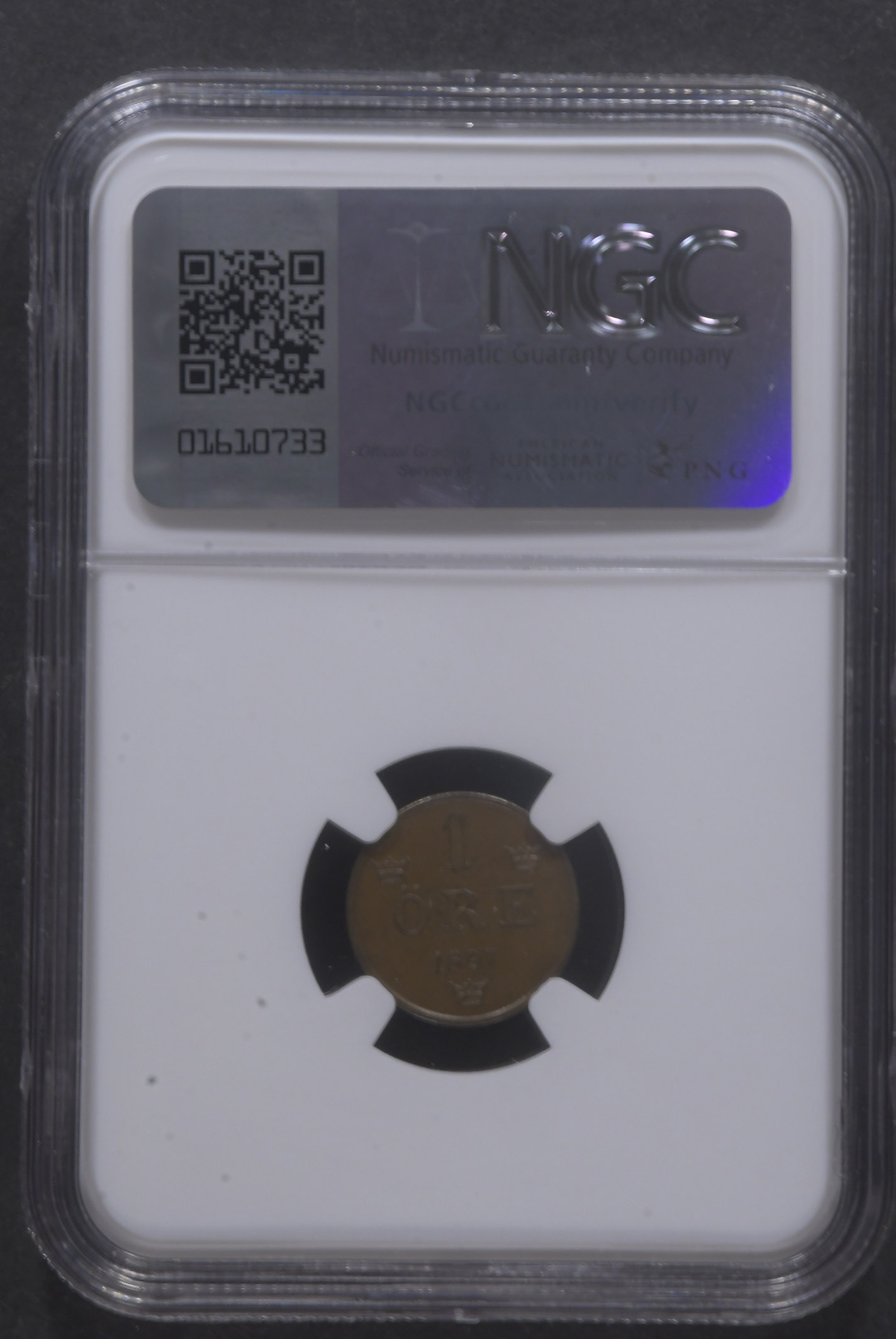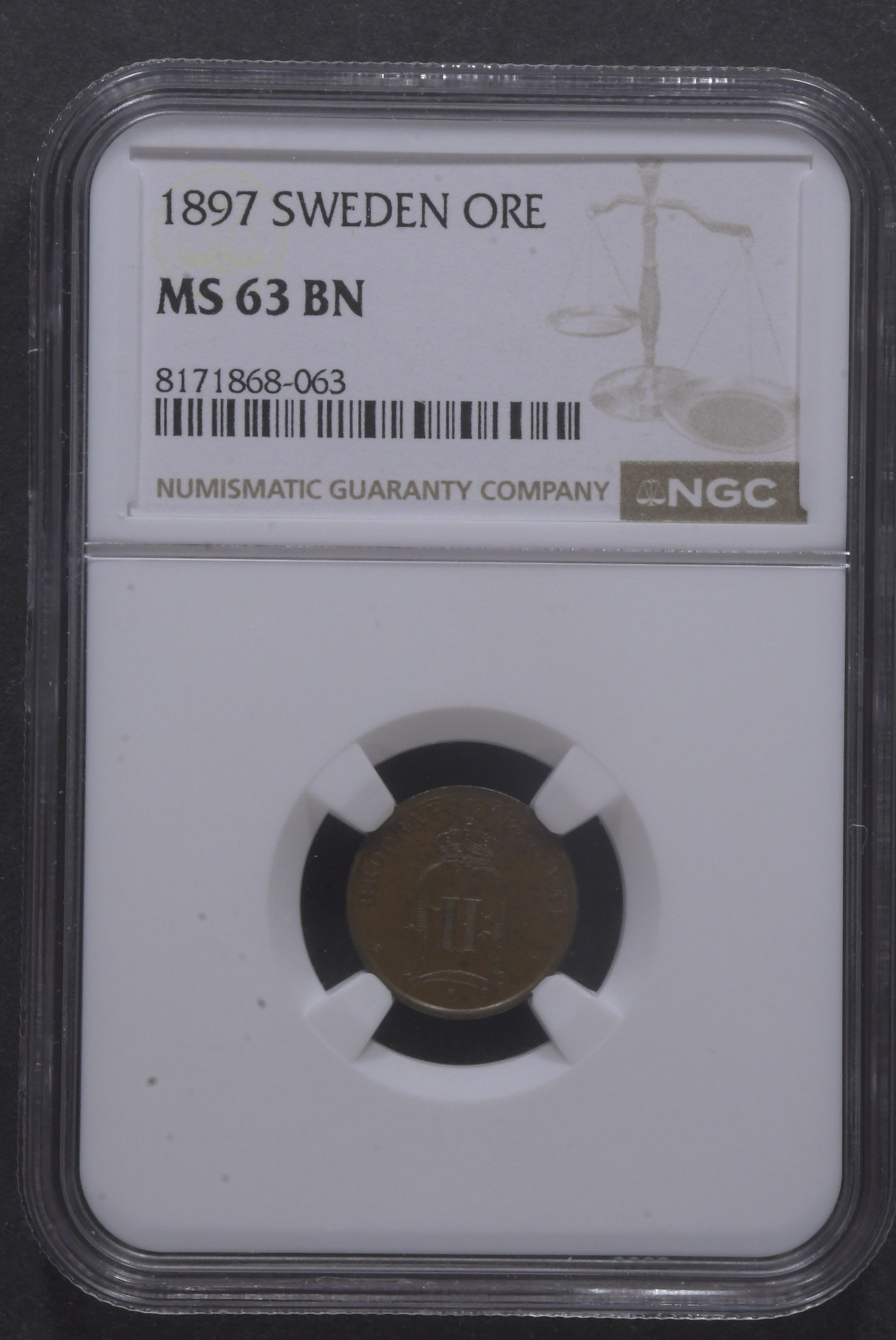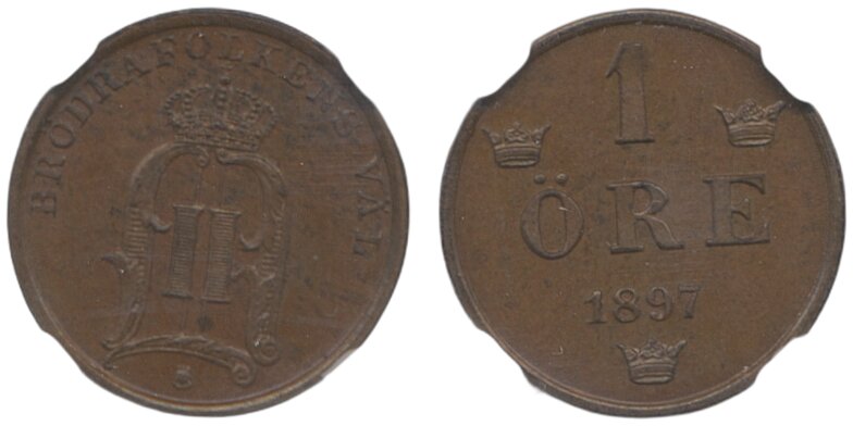 Coins, Sweden. Oskar II, MIS III.22, 1 öre 1897. Graded by NGC as MS63 BN. 01/0. See certification at NGC