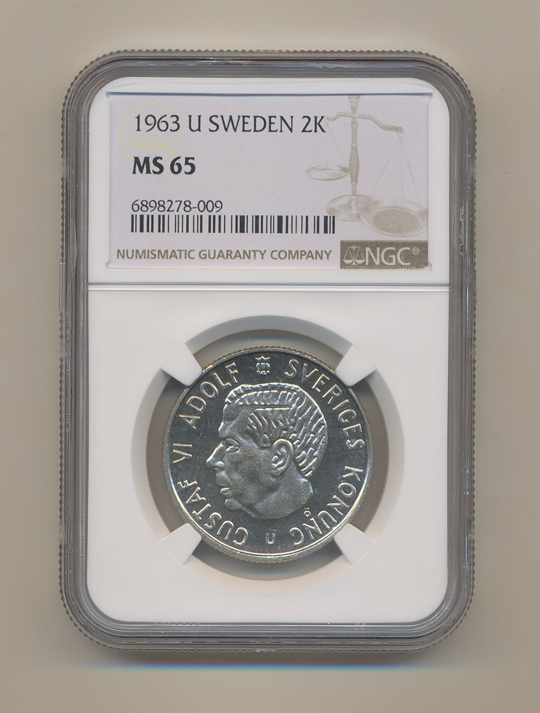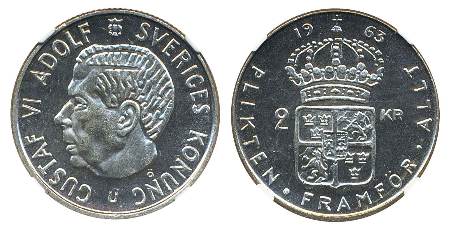 Coins, Sweden. Gustav VI Adolf, MIS I.10, 2 kronor 1963. Graded by NGC as MS65. 0. See certification at NGC