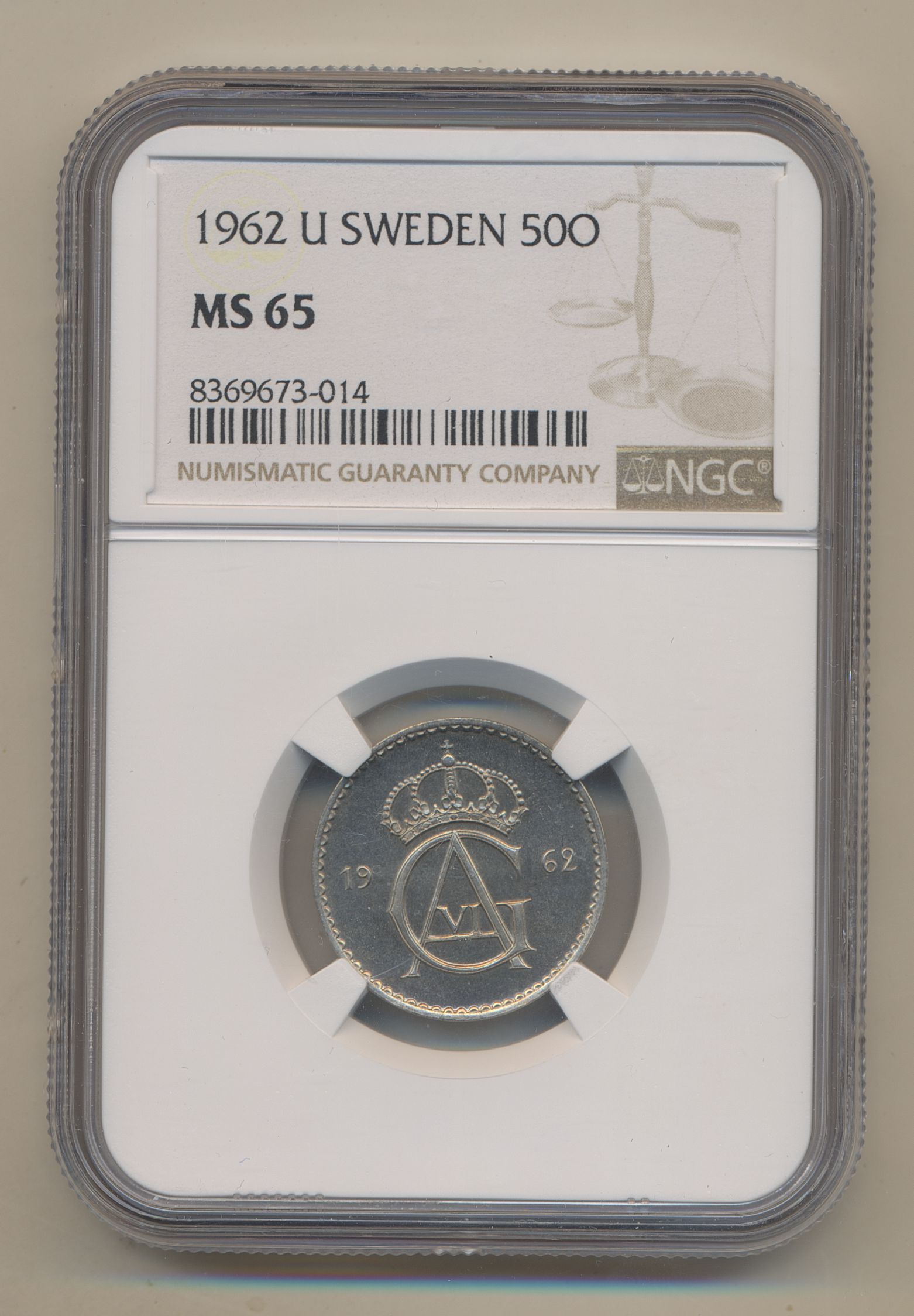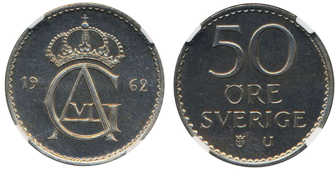 Coins, Sweden. Gustav VI Adolf, MIS II.1, 50 öre 1962. Fully prooflike surfaces. Graded by NGC as MS65. 0. See certification at NGC