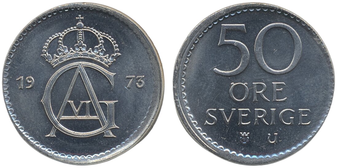 Coins, Sweden. Gustav VI Adolf, MIS II.12, 50 öre 1973. Superb example with interesting mint error struck out of collar on a seemingly too large planchet. 0.