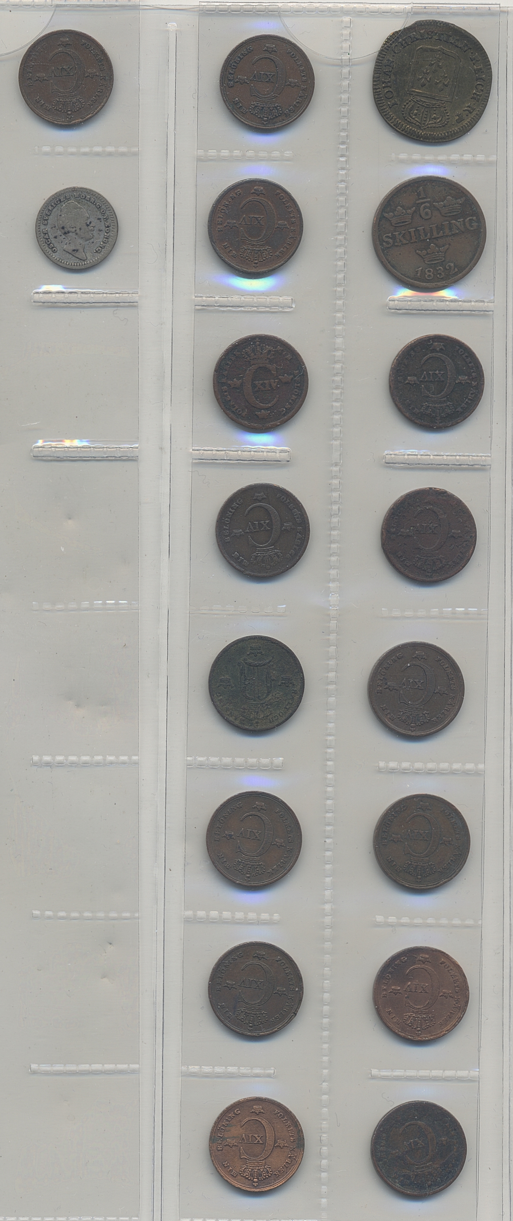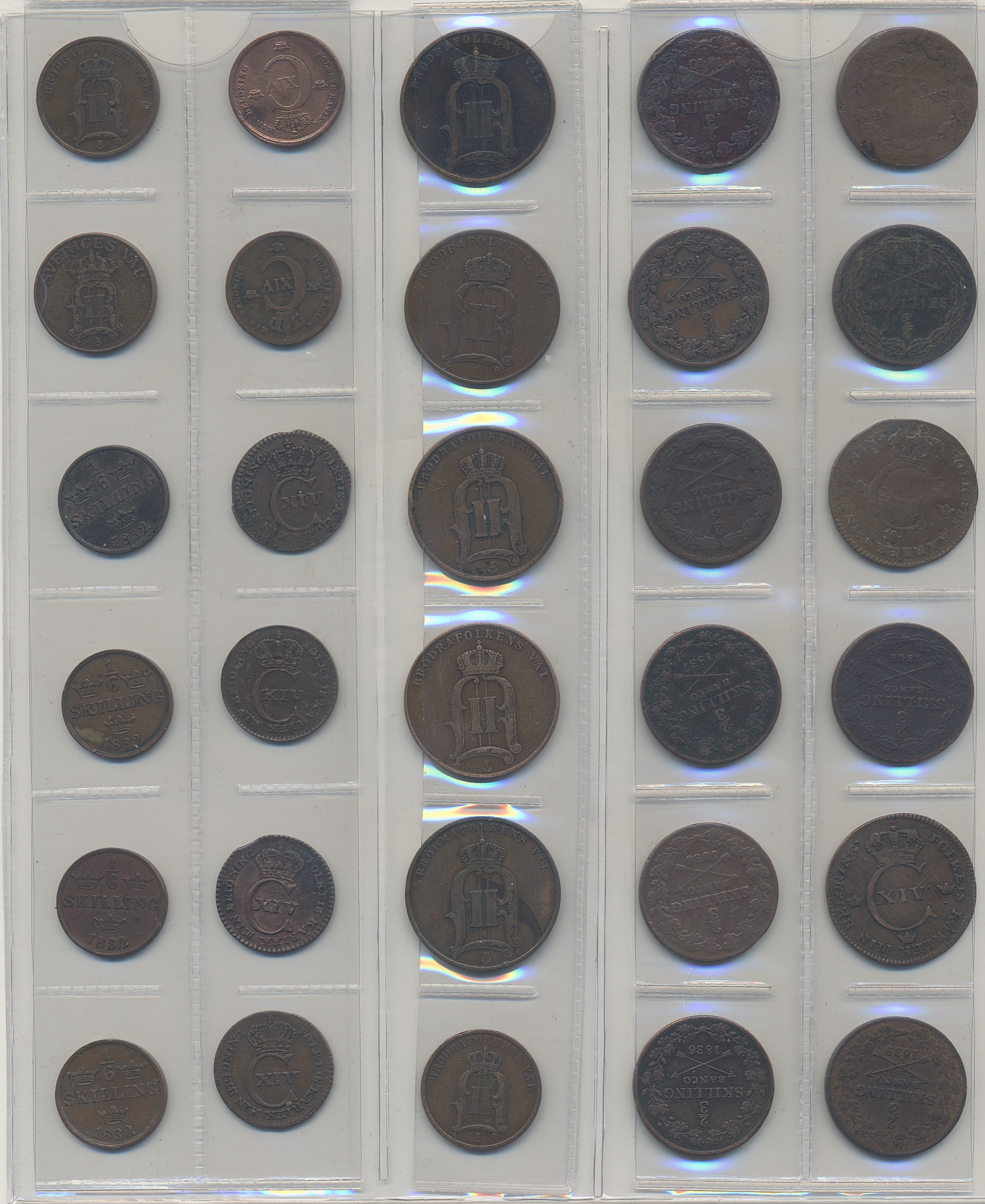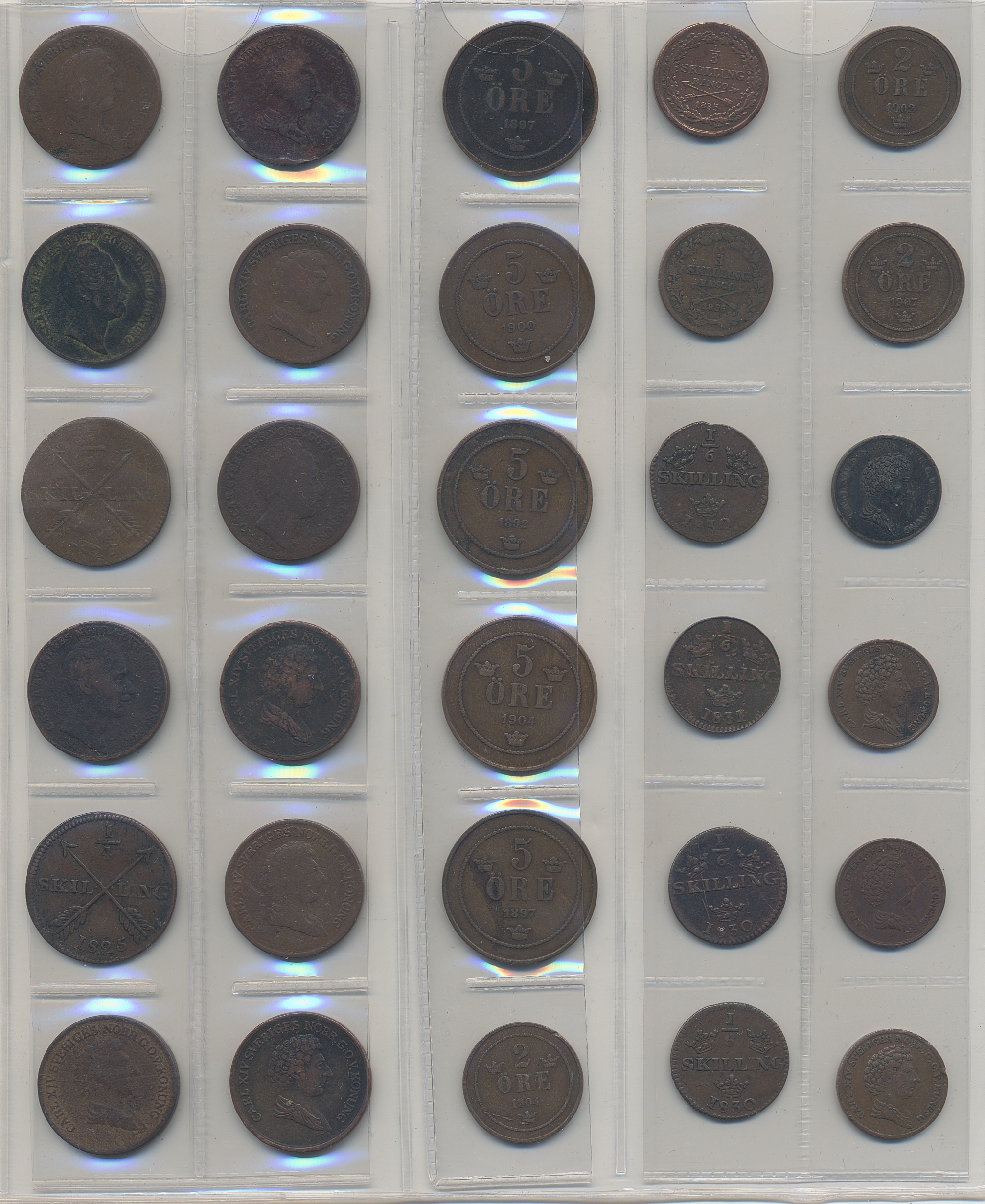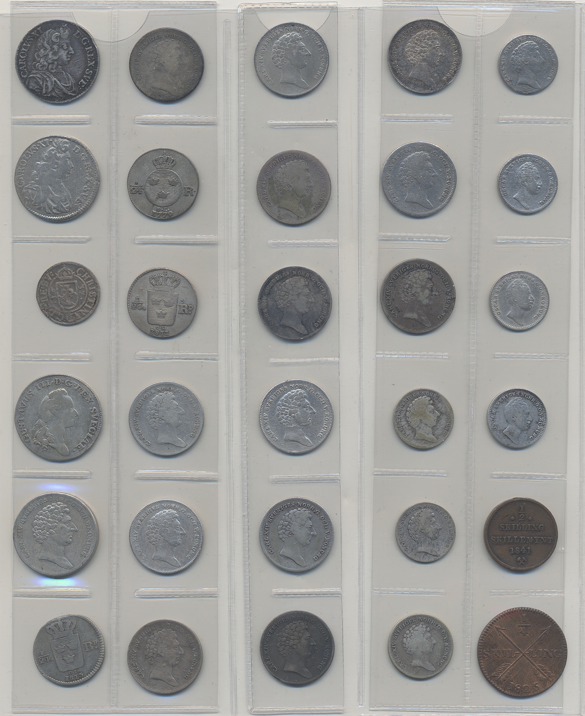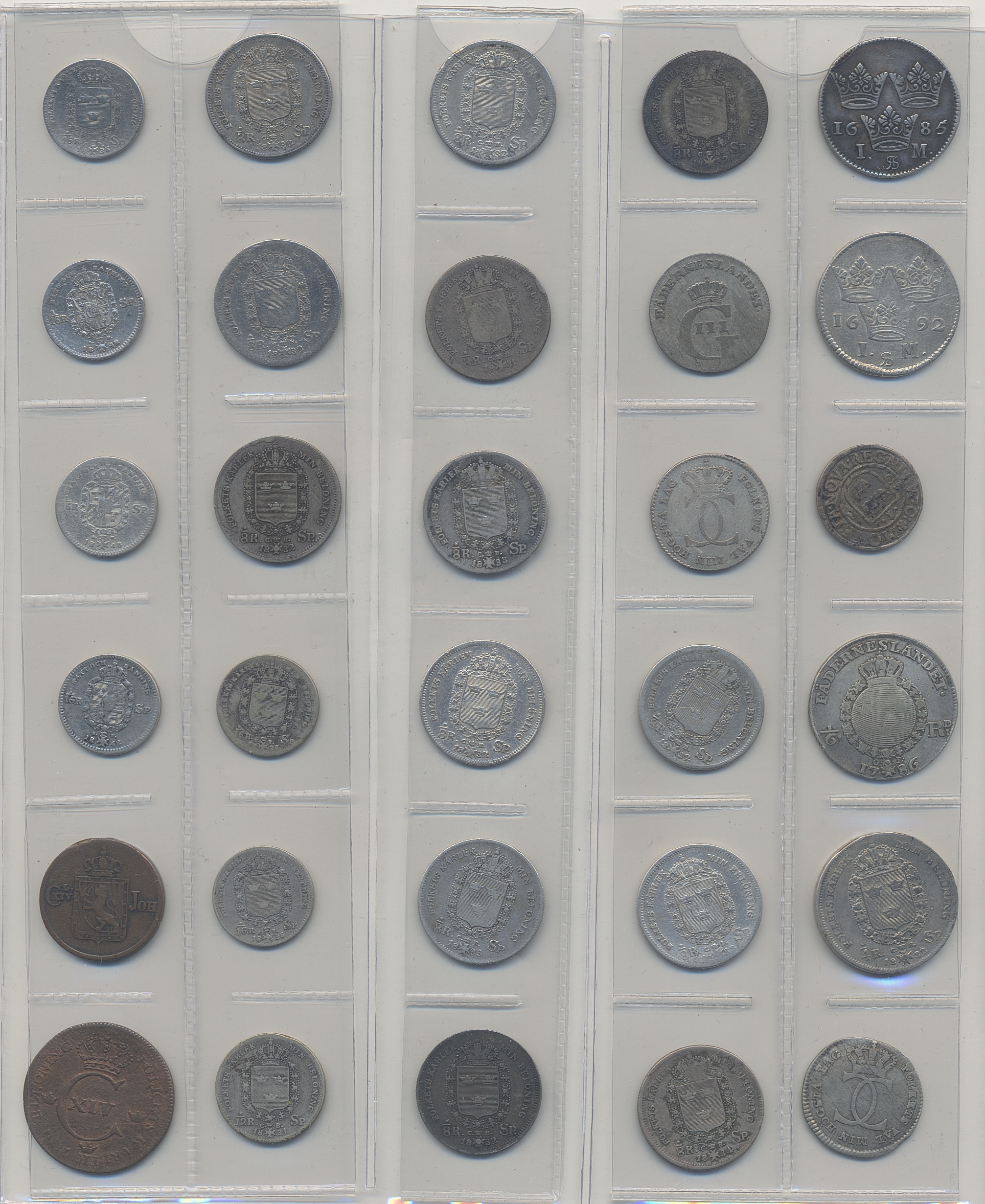 Coins, Sweden. Group of Swedish silver and copper coins from 1600s–1900s. Please inspect! Also a few Swedish banknotes. Mixed quality. 1?-1+/01.