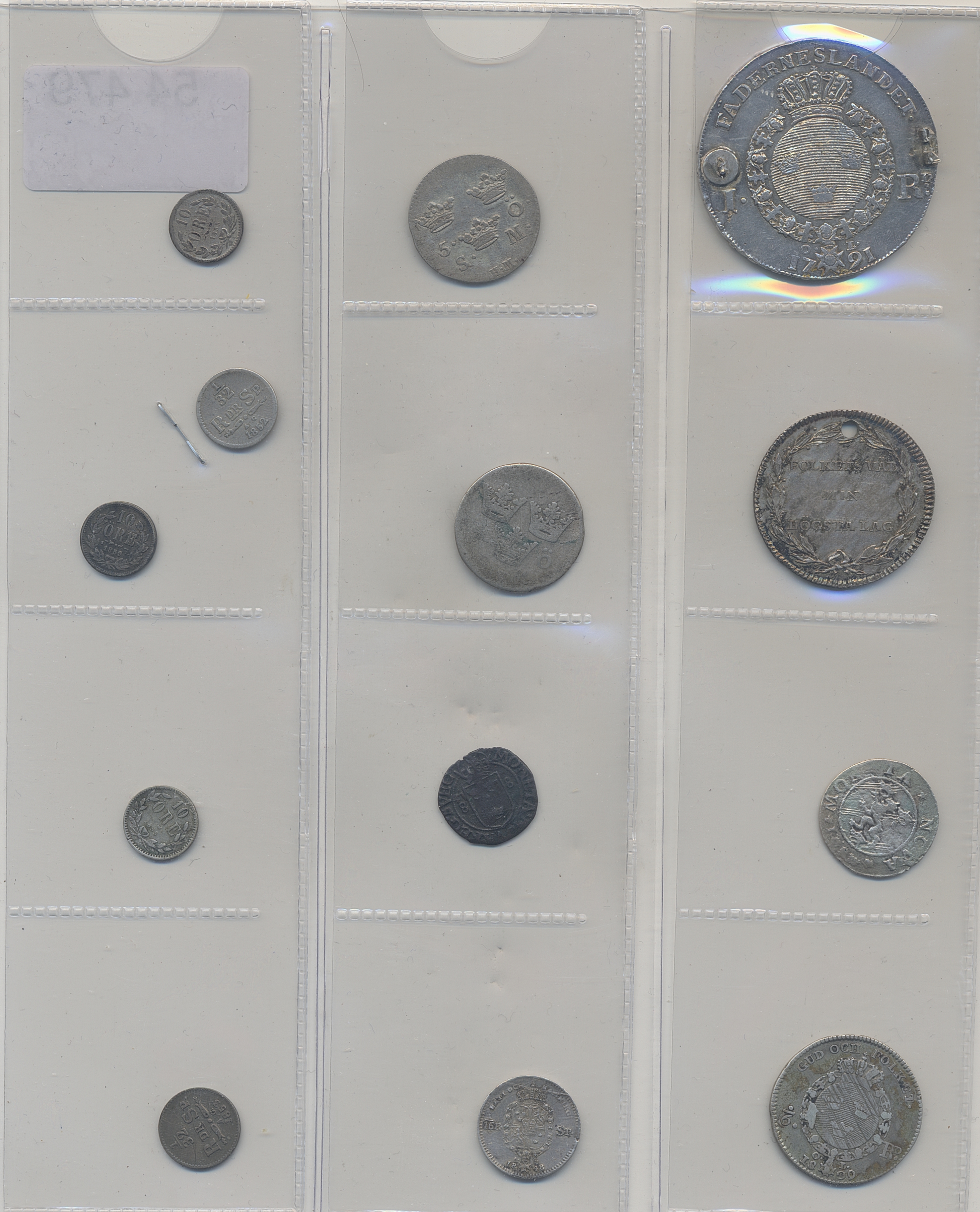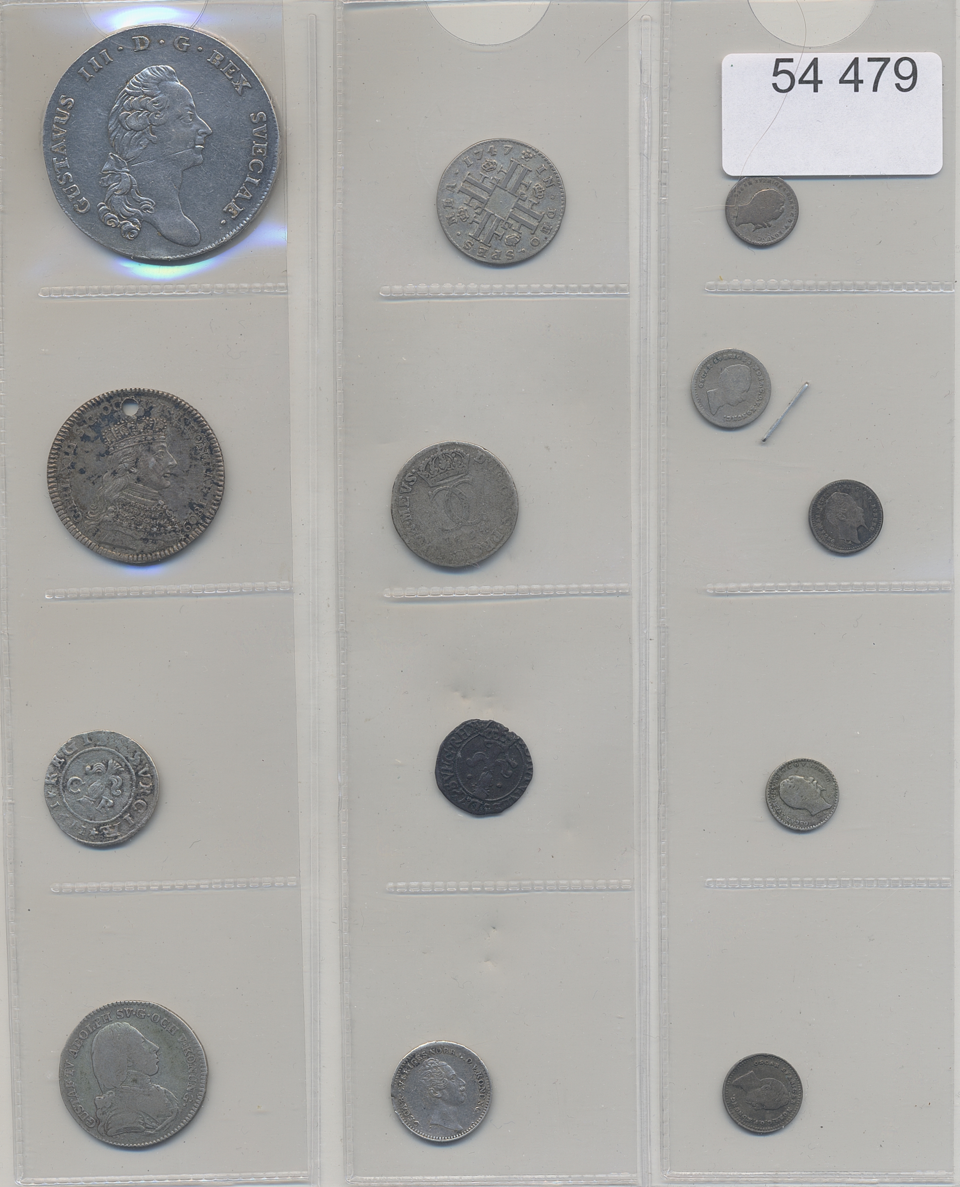 Coins, Sweden. Small lot of 13 silver coins including mounted Gustav III riksdaler and pierced largesse money. Please inspect! Mixed quality. 1?-1+.