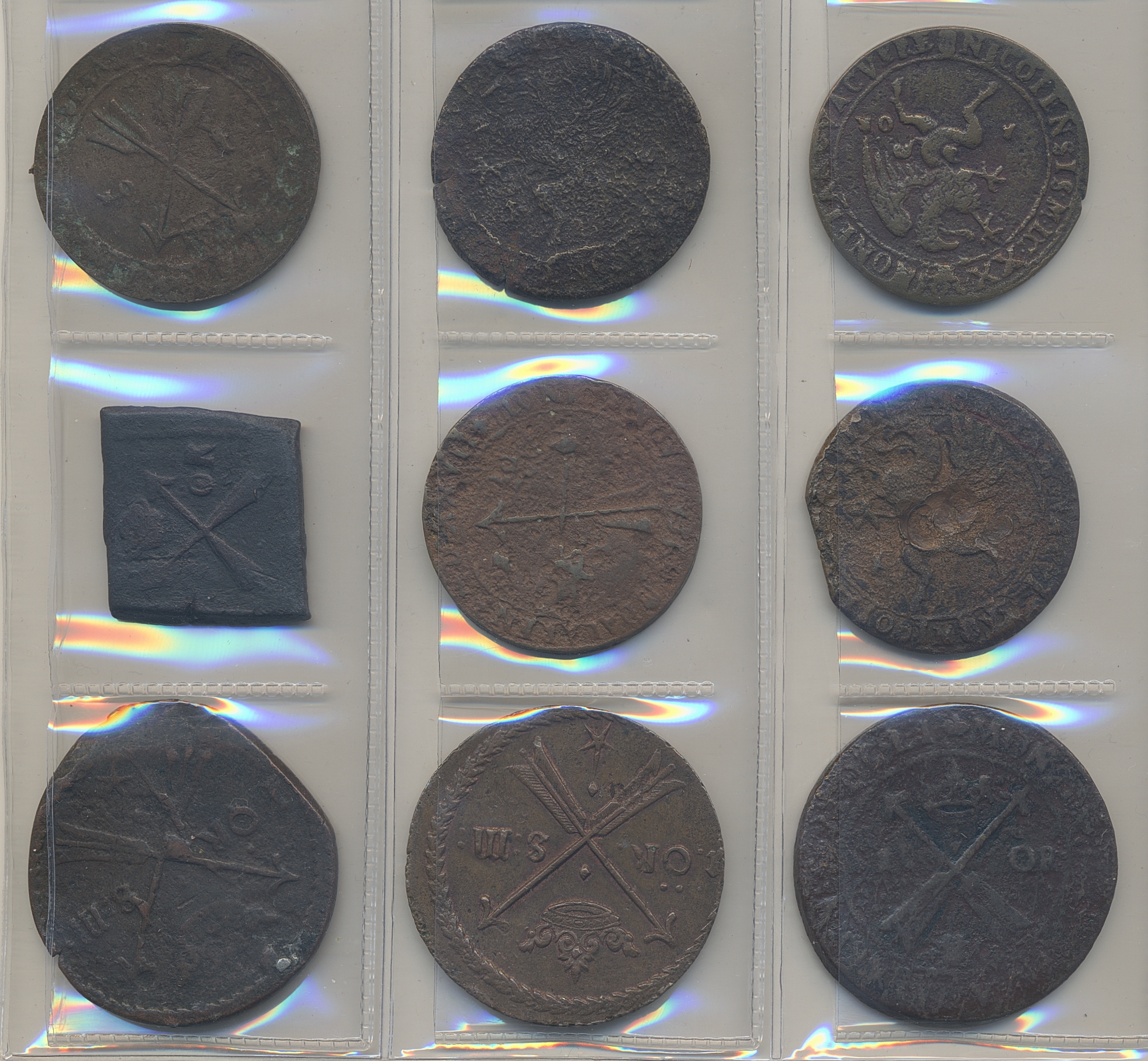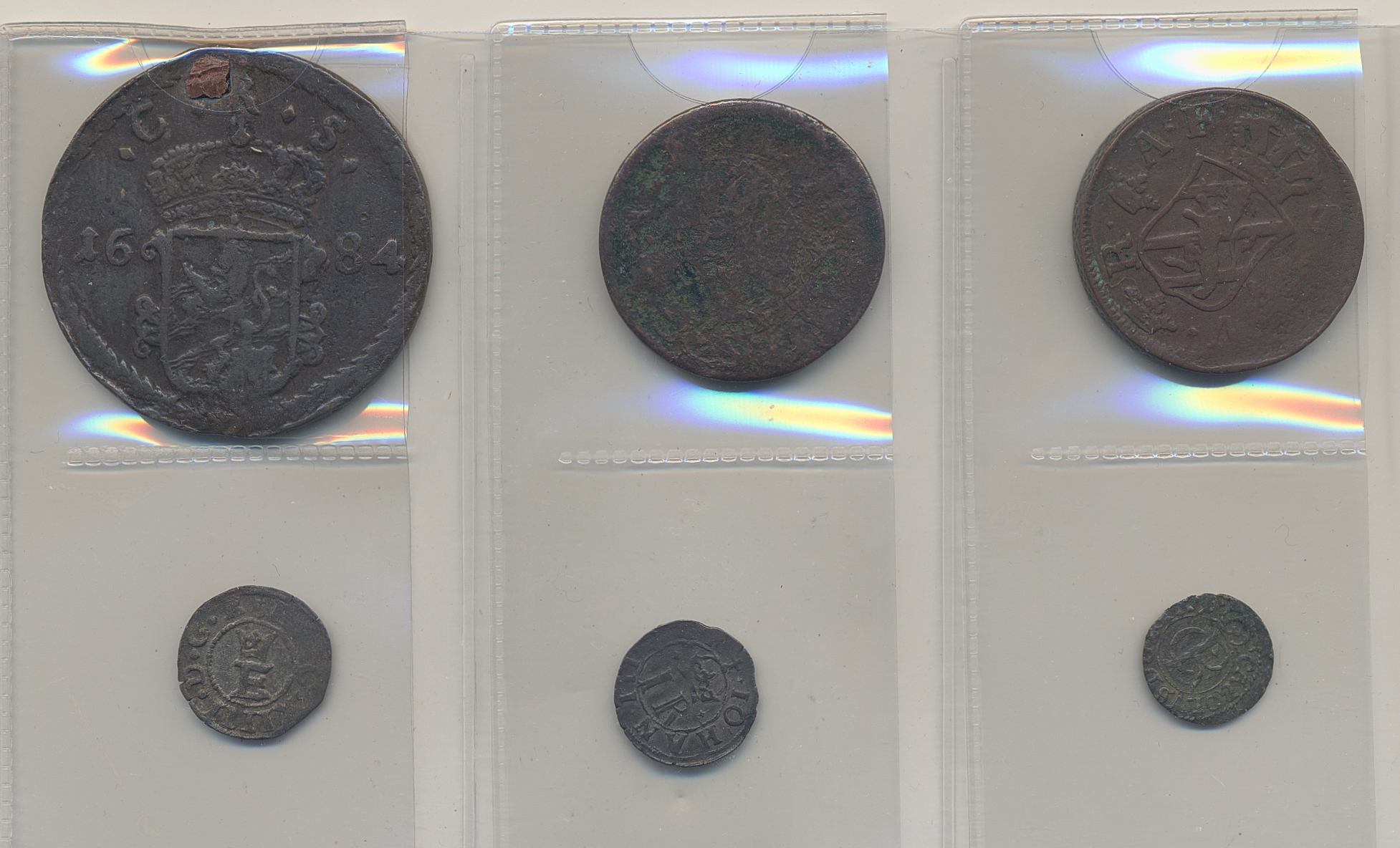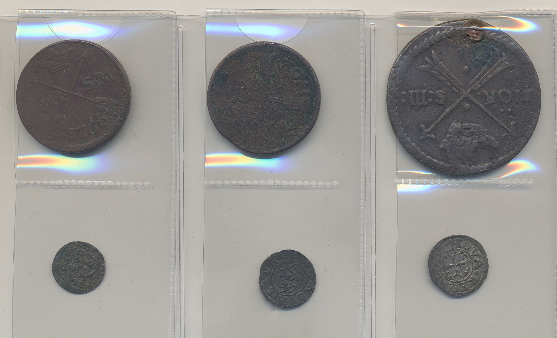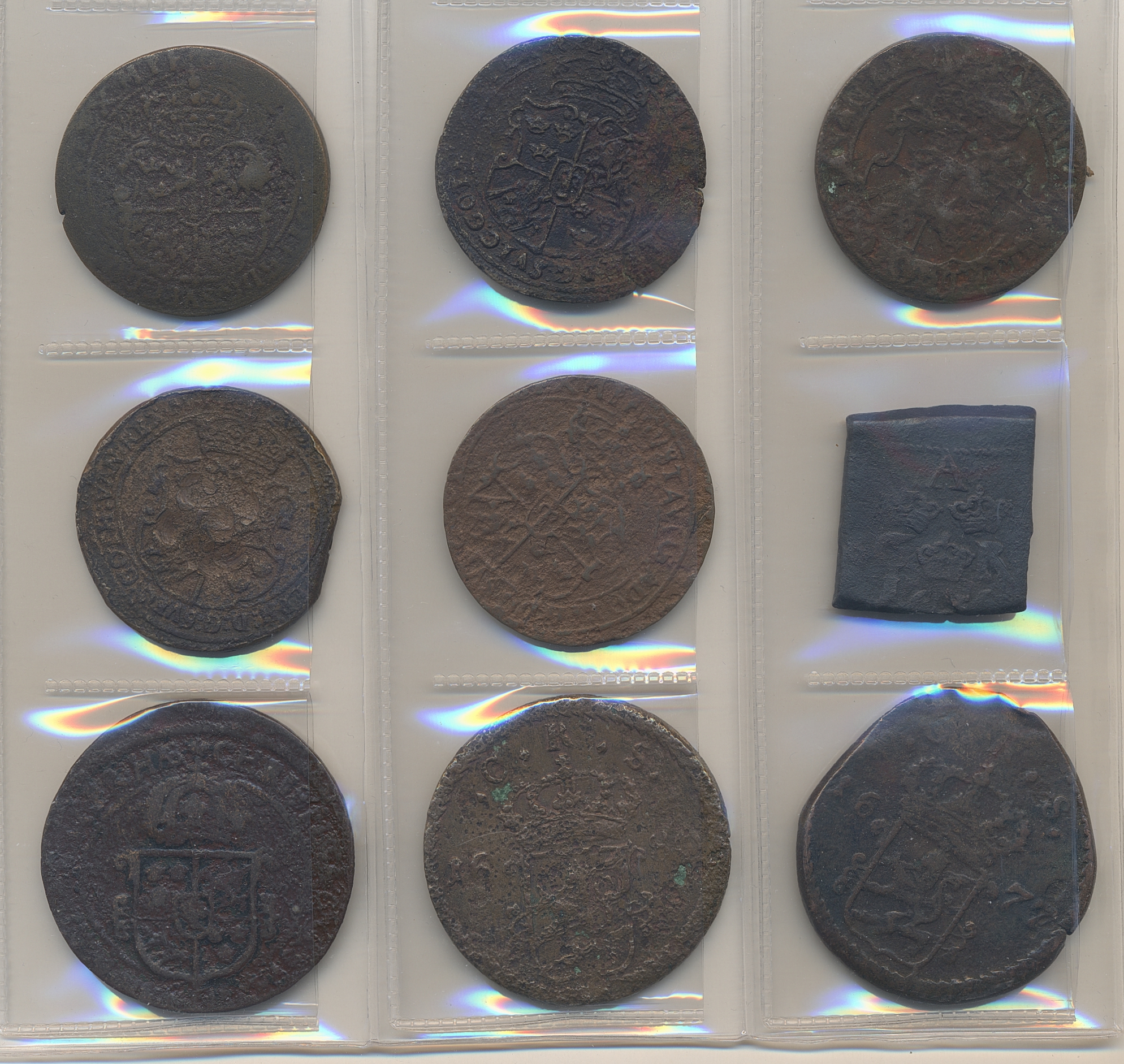 Coins, Sweden. Lot of twelve copper coins Gustav II Adolf–Adolf Fredrik + Swedish possessions, three silver coins Erik XIV–Karl XI. The entire lot is presented at www.philea.se.