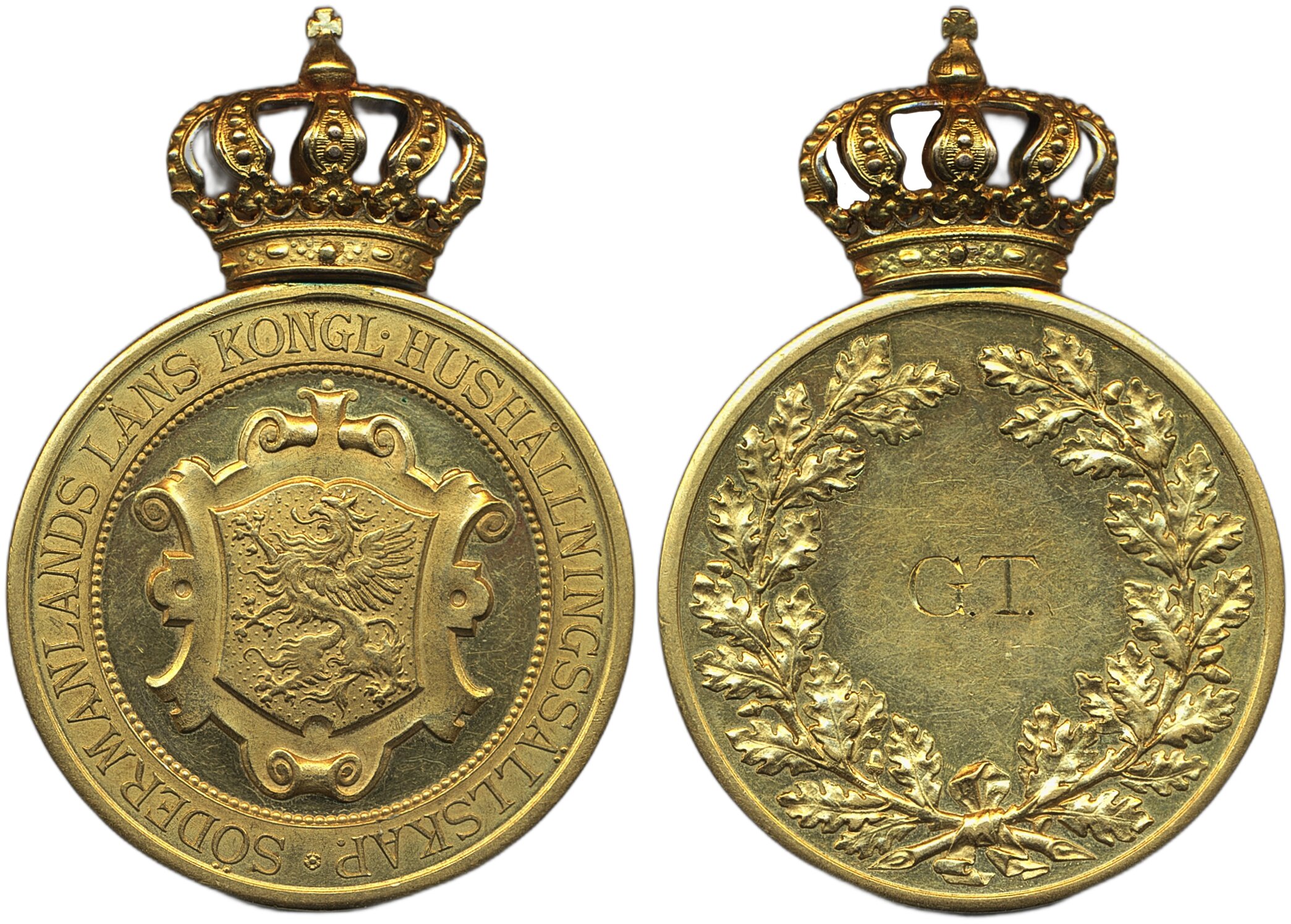 Medals, non-regal, Sweden. 58.26 g. Gold medal, 18 carat, to Södermanlands Läns Kongl. Hushållningssällskap, 'Guld 1919' on edge (Gold 1919). Engraved 'G.T.' on reverse (Initials of recipient). Lightly cleaned. Scarce in gold. 1+/01.
