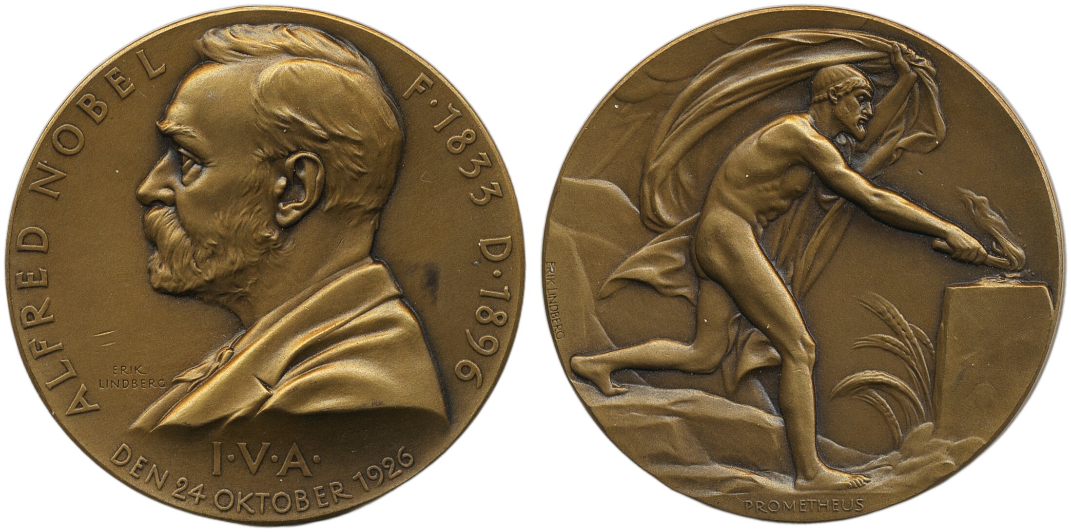 Medals, non-regal, Sweden. Ehrensvärd 265, 36.80g. 45 mm. Alfred Nobel memorial bronze medal by E. Lindberg. 1926. 01/0.