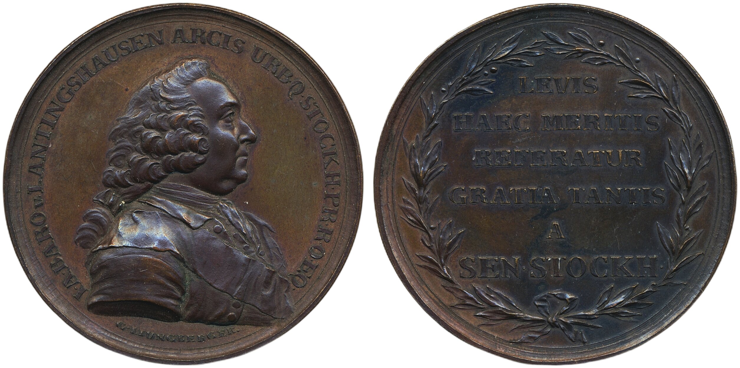 Medals, non-regal, Sweden. Hyckert I:218:1, Jacob Albrekt von Lantigshausen (1699–1769). Governor-general in Stockholm. Bronze medal, 52 mm, 53,71 g., by G. Ljungberger for the Magistrate of Stockholm 1770.