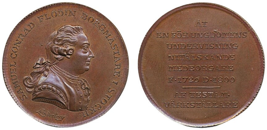 Medals, non-regal, Sweden. Hyckert I:332, Samuel Conrad Flodin. Mayor of Stockholm, donor. Bronze medal, 35 mm, 12.46 g., by L D Lunderberg 1800. Good 01.