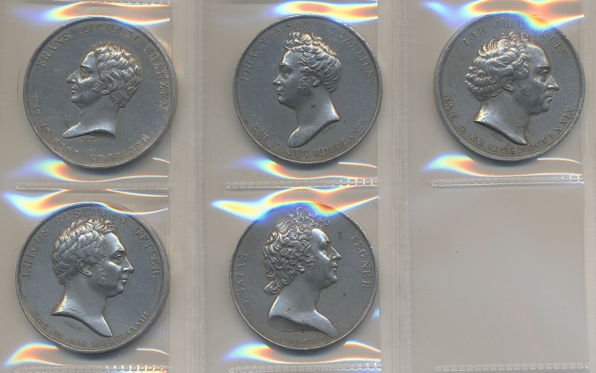 Medals, non-regal, Sweden. Lot. Five tin medals by C. M. Mellgren. The entire lot is presented at www.philea.se. Mixed quality.