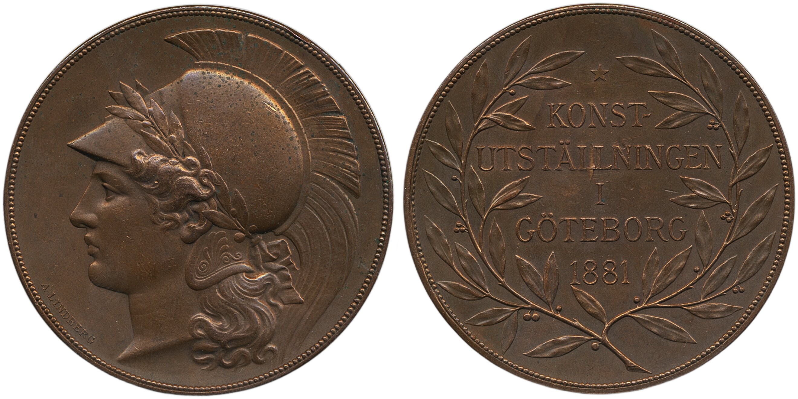 Medals, non-regal, Sweden. 1881. 76.93 g. bronze medal. Konstutställningen i Göteborg (Art Exhibition in Gothenburg) 1881, 53 mm, by A. Lindberg. 1+/01.