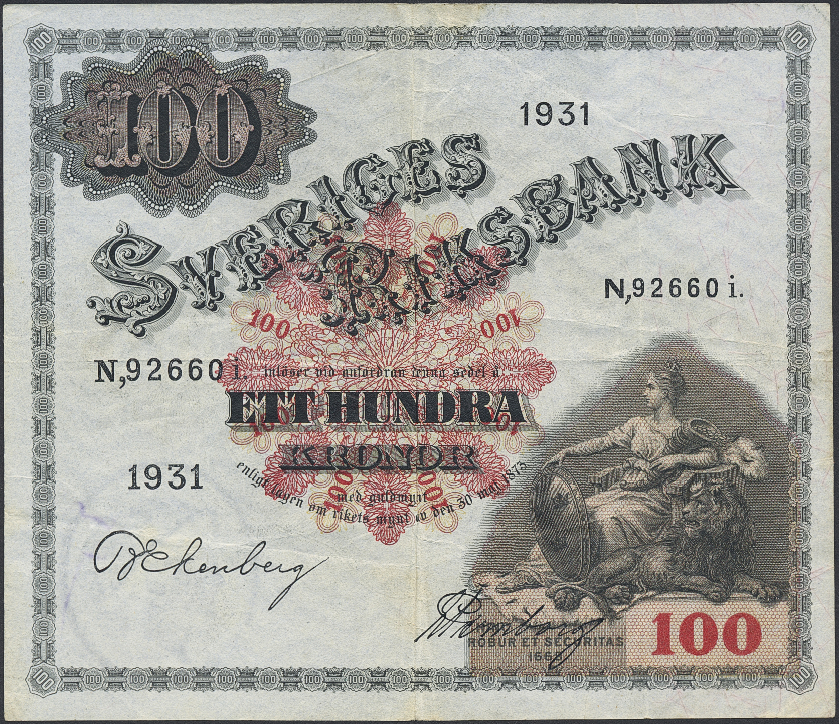 Banknotes, Sweden. SF U8:14, 100 kronor 1931. N92660i. Minor ink writing on reverse. 1.