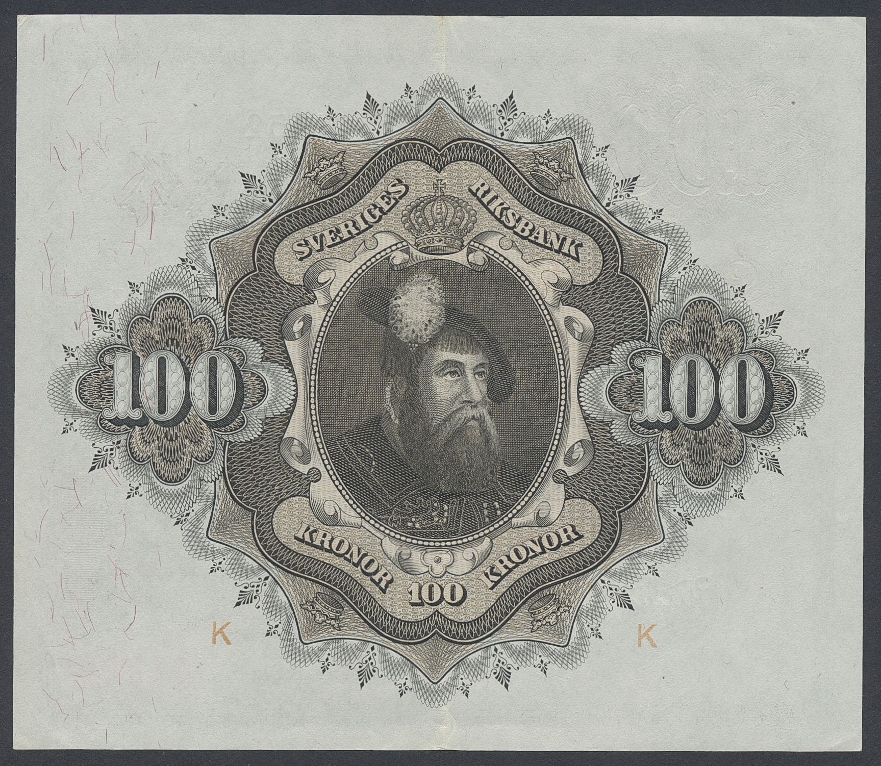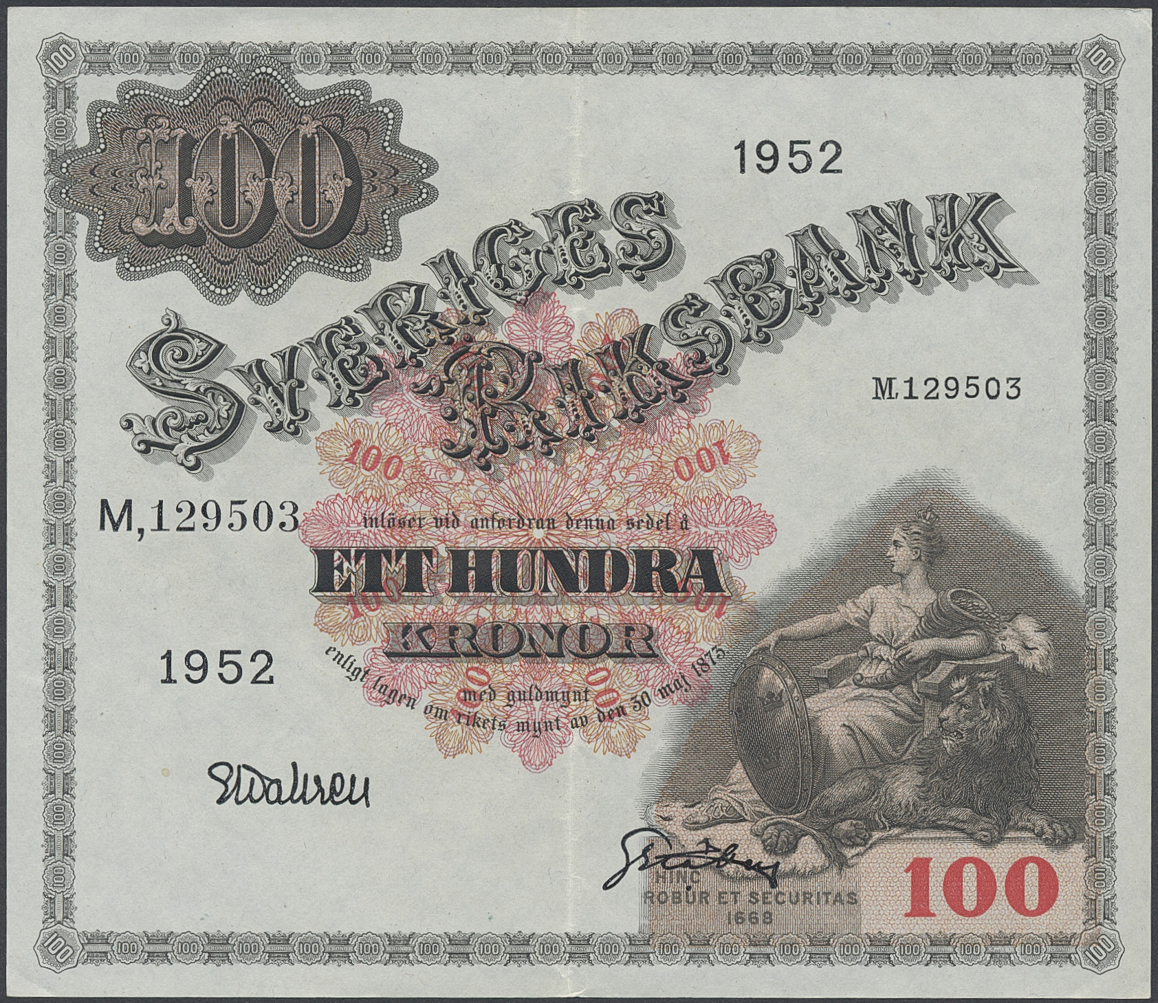 Banknotes, Sweden. SF U10:6, 100 kronor 1952. M129503. Light centre fold else very fresh paper. 01.