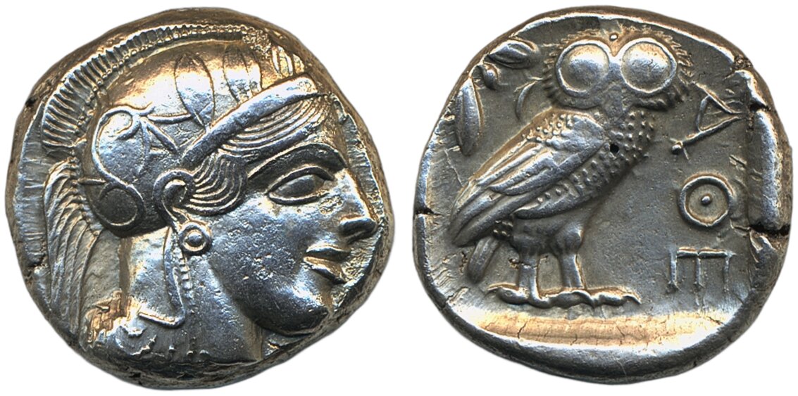 Coins, Ancient, Greek coins. Sear 2526, Attica. Athens (449–413 B.C.). Tetradrachm, 17.17 g. Head of Athena/Owl standing right. Minor planchet crack. VF-XF.