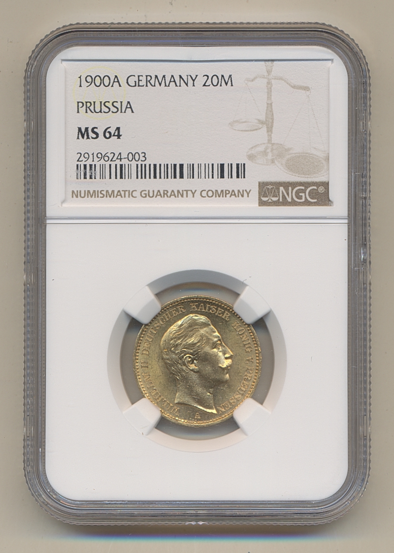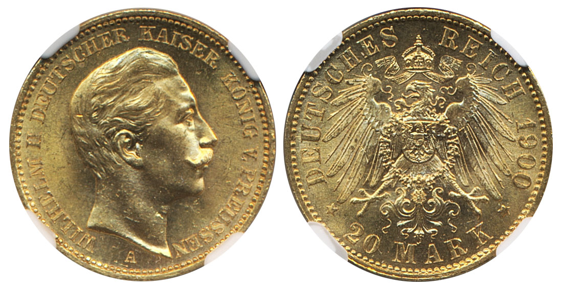 Coins, Germany, Prussia. Wilhelm II (1888-1918), KM 521, 20 mark 1900 A. Graded by NGC as MS64. XF-UNC. See certification at NGC